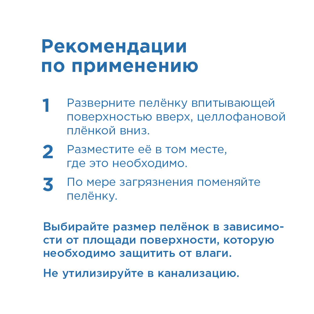 Подберите оптимальный размер пеленок в соответствии с Вашими потребностями: пеленка не должна быть выражено мала; механическое уменьшение размера (обрезание) приведет к утрате пеленкой своих функций.