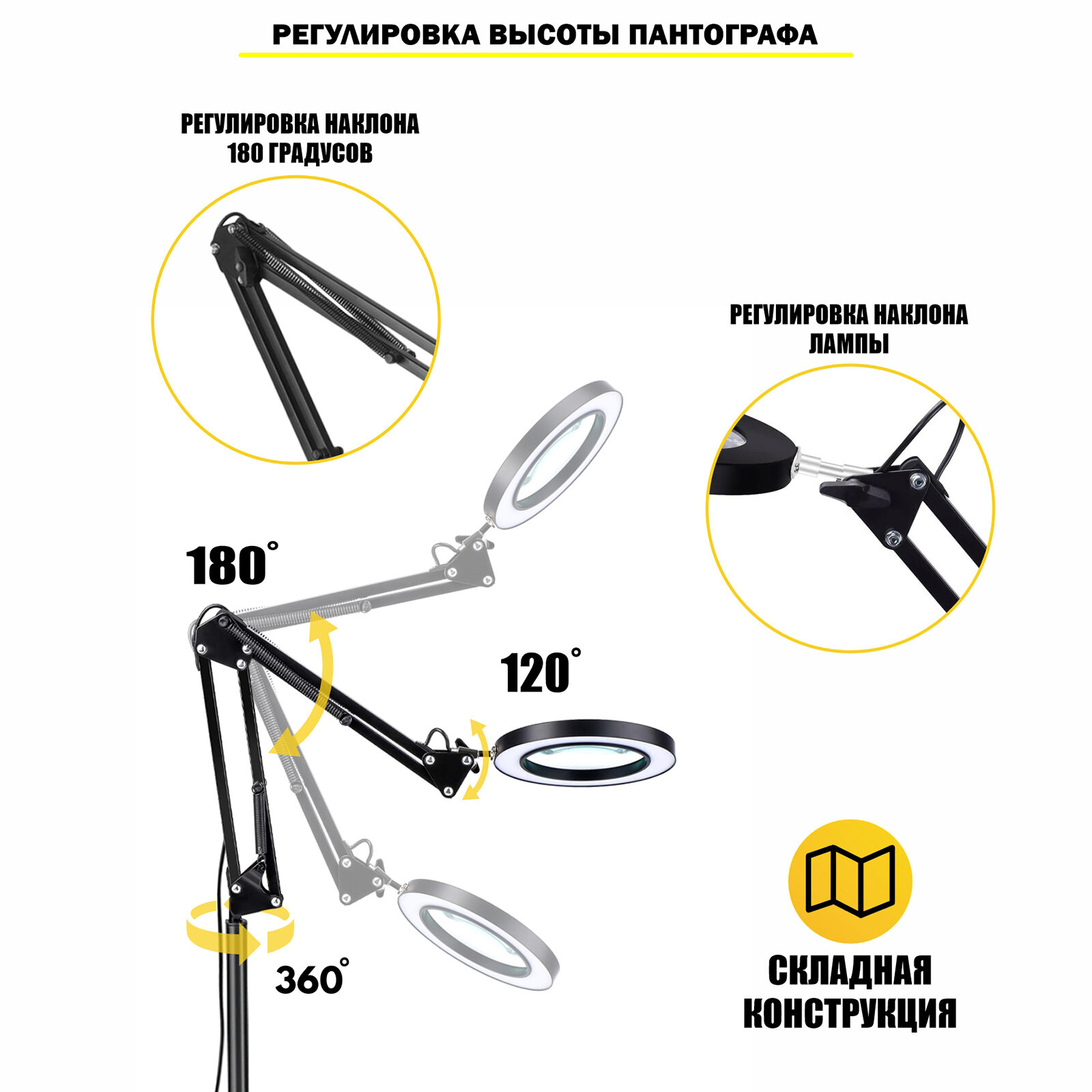 | Дополнительная информация | Данная стойка с лампой лупой позволяет освободить Ваши руки и место не рабочем столе. Также это может быть отличное решение для дополнительного источника света в комнате или же для напольного торшера для чтения. Комфортная регулировка стойки обеспечит комфортную и универсальную подсветку. |