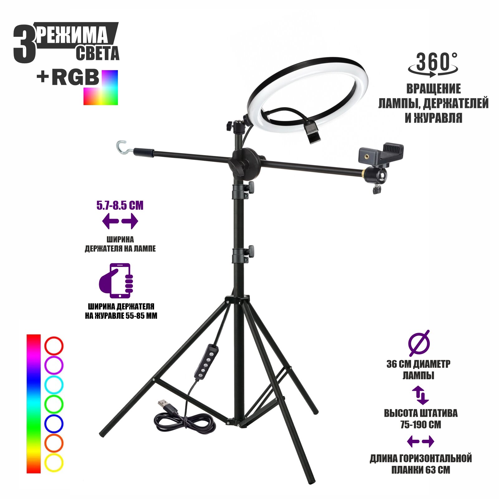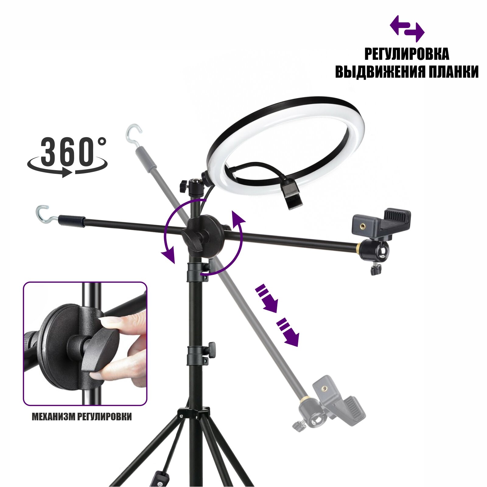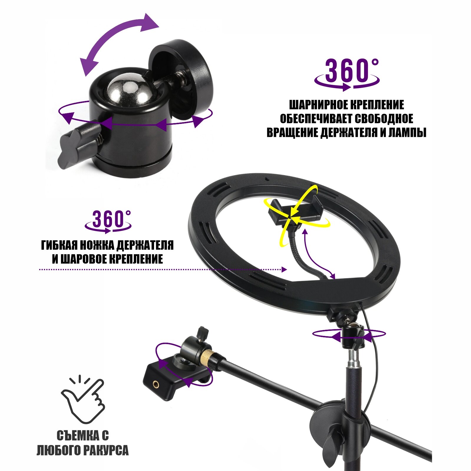Купить Напольная стойка штатив JBH-G114 с кольцевой лампой 36 см, крючком для противовеса и держателем телефона для горизонтальной съемки с доставкой по всей России.