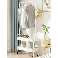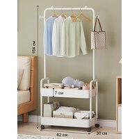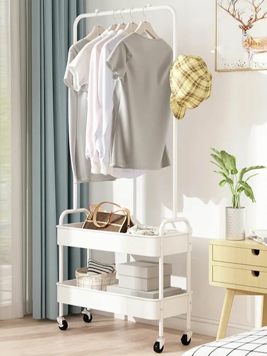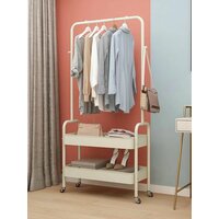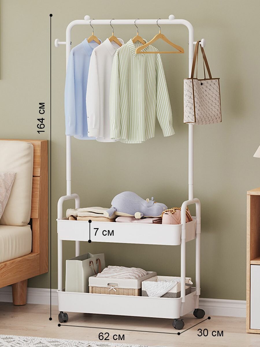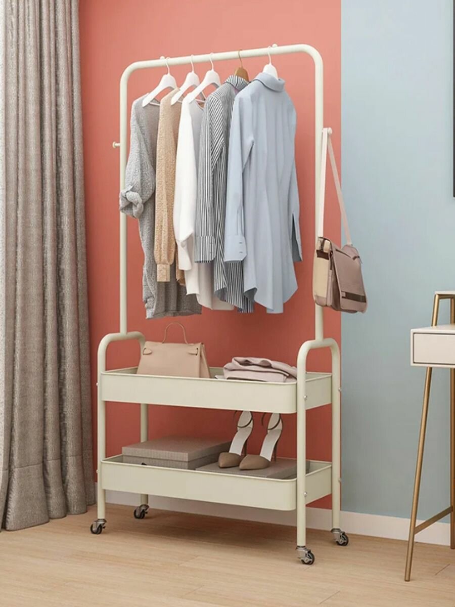 Вешалка оснащена колесами, что обеспечивает удобство перемещения по комнате и позволяет легко менять место хранения.