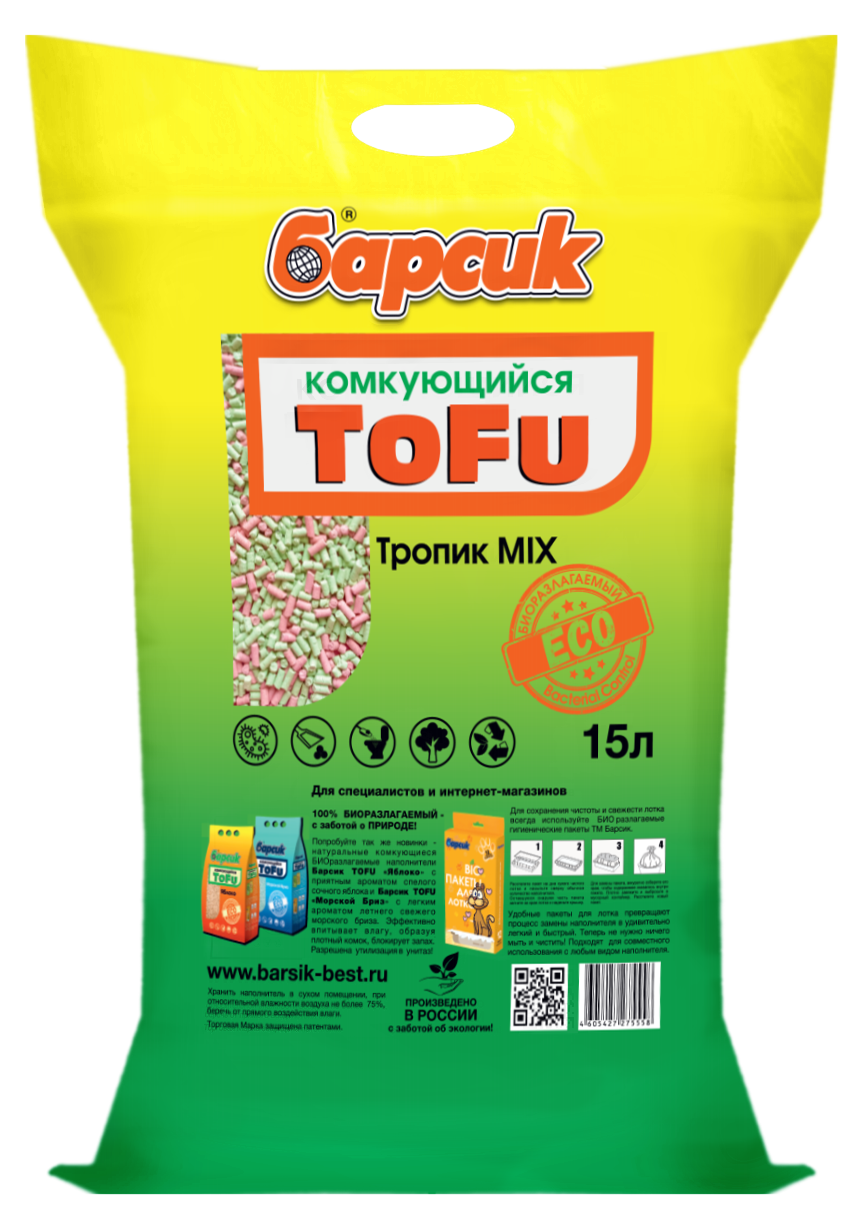 Натуральный комкующийся наполнитель для кошачьего туалета TOFU Барсик Тропик микс 15л: сравнение цен, характеристики, фото, актуальное наличие и цены.