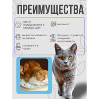 Удобство в уходе. Благодаря голубому индикатору легко определяется часть наполнителя, подлежащая утилизации. Образует крепкий голубой комок, при этом не окрашивая стенки лотка и лапки питомца. Смывается в унитаз.