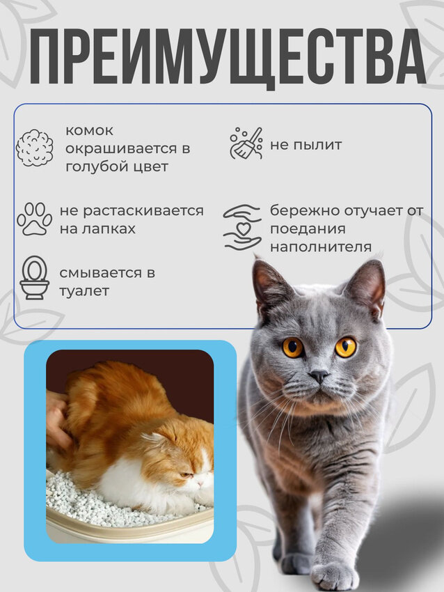 Особенности наполнителя: Антибактериальный, Без ароматизатора, Без пыли, Гипоаллергенный, Не прилипает к лапам, Поглощает запах, Смывается в унитаз, Для нескольких кошек, Гранулированный