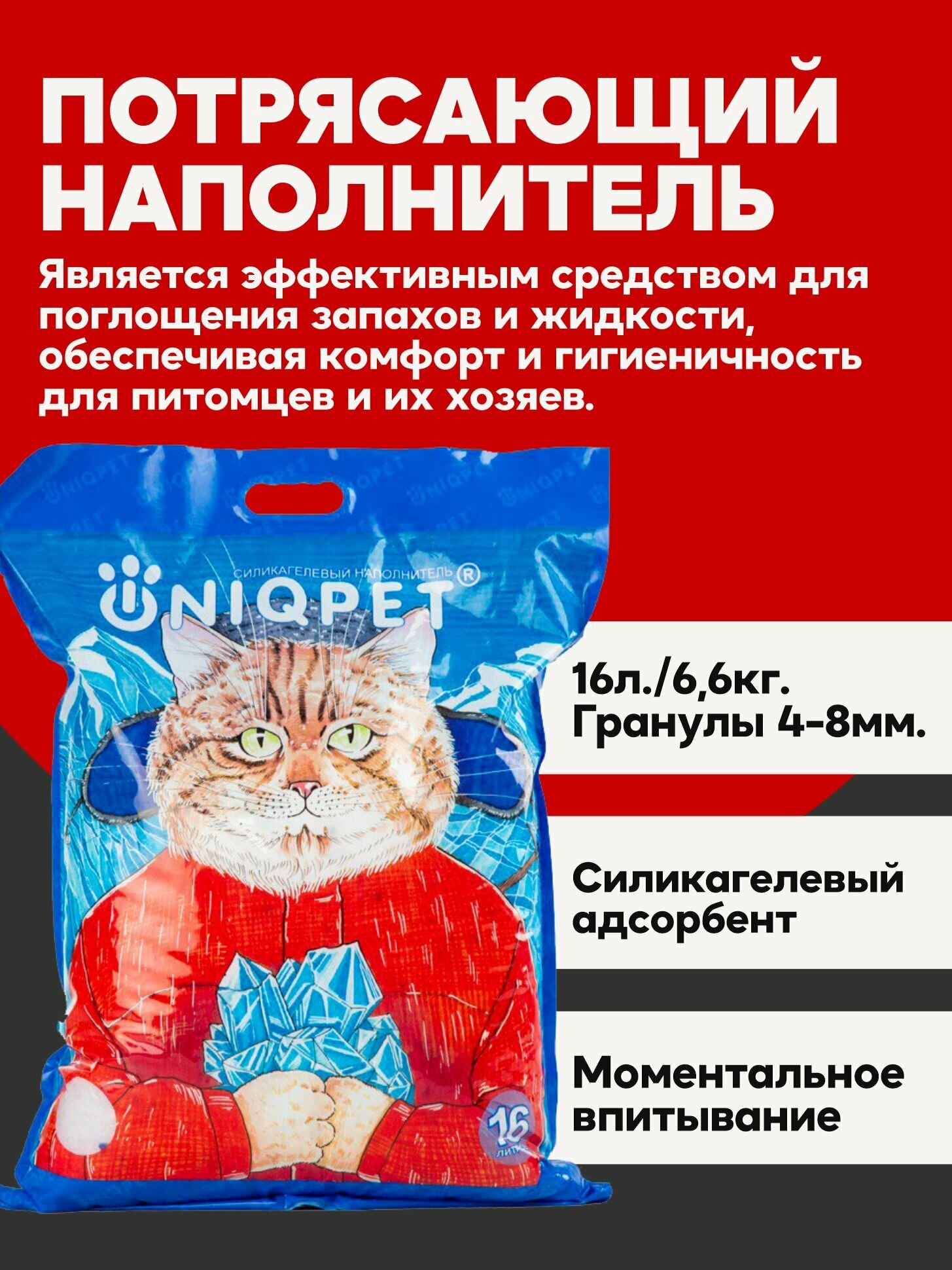 Наполнитель силикагелевый UNIQPET - это премиальный наполнитель из крупных гранул (4-8мм). Наполнитель очень экономичный - содержимое лотка можно убирать один раз в 20-30 дней , что в 1.5 -2 раза реже по сравнению с комкующимися наполнителями (древесный, соевый или глиняный). Пакеты для лотка, упростят уборку наполнителя. Силикагелевый наполнитель для кошек состоит из специальных кристаллов, которые мгновенно впитывают влагу и запахи, не допуская ее испарения и образования неприятного запаха. Наполнитель для кошек селикагелевый на ощупь всегда остается сухим и поэтому не прилипает к лапкам и шерсти, всегда оставаясь в лотке. Силикагель обладает антибактериальными свойствами и поэтому ваш кошачий лоток не только защитит вас от запаха животных, но и будет препятствовать росту бактерий. Наполнитель силикагелевый экологичен и безопасен (без отдушек, токсинов и аллергенов) при этом моментально поглощает влагу и запах. Эксперименты показали, что 100гр наполнителя UNIQPET поглощают 100мл жидкости. Это означает, что впитывающие способности наполнителя высочайшие! Селекагелевый наполнитель для кошачьего туалета UNIQPET обеспечит свежесть и чистоту лотка, а также отсутствие запахов в доме, где живет кошка или собака мелких и средних пород. Наполнитель для кошек упакован в плотный пакет с ручкой.