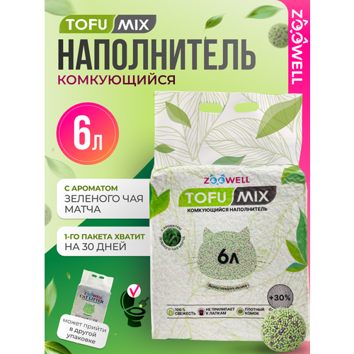 Смешанный наполнитель для кошачьего туалета ZooWell с ароматом зеленого чая Матча изготовлен из высококачественного соевого сырья и натурального природного бентонита с применением научно обоснованной формулы расчета состава и соотношения ингредиентов. Растительное сырье, входящее в состав наполнителя безвредно для людей, домашних животных и окружающей среды. Случайное поедание наполнителя ZooWell питомцами безвредно. Смешанный наполнитель для кошачьего туалета ZooWell: • обладает натуральным ароматом зеленого чая Матча и не содержит искусственных ароматизаторов в своем составе. • имеет низкое пылеобразование – менее 2% в течение всего времени использования. • быстро впитывает жидкости и образует плотный комок – в течение 1,5-3 секунды. • позволяет смывать комки и отходы в унитаз порционно, благодаря быстрому растворению в воде до жидкой консистенции. • благодаря большому количеству антиоксидантов и противовоспалительных веществ, содержащихся в чае Матча, добавленном в состав соевых палочек наполнителя ZooWell, наполнитель обладает антибактериальными и фунгицидными свойствами. • идеально подходит для автоматических туалетов благодаря быстрому и активному формированию комков и диаметру гранул и палочек ≤ 2 мм. Состав наполнителя: Тофу (соя), кукурузный крахмал, бентонит, гуаровая камедь, экстракт чая Матча.