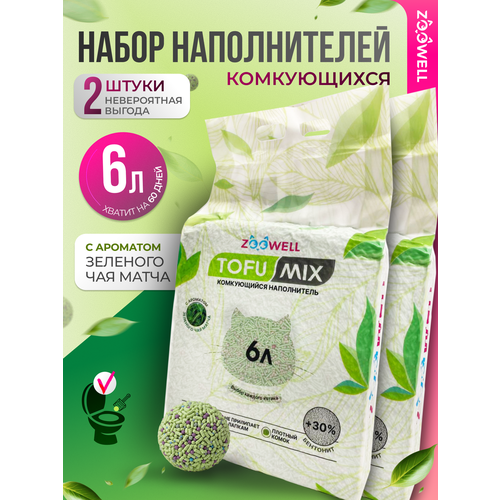 Смешанный наполнитель для кошачьего туалета ZooWell с ароматом зеленого чая Матча изготовлен из высококачественного соевого сырья и натурального природного бентонита с применением научно обоснованной формулы расчета состава и соотношения ингредиентов. Растительное сырье, входящее в состав наполнителя безвредно для людей, домашних животных и окружающей среды. Случайное поедание наполнителя ZooWell питомцами безвредно. Смешанный наполнитель для кошачьего туалета ZooWell: • обладает натуральным ароматом зеленого чая Матча и не содержит искусственных ароматизаторов в своем составе. • имеет низкое пылеобразование – менее 2% в течение всего времени использования. • быстро впитывает жидкости и образует плотный комок – в течение 1,5-3 секунды. • позволяет смывать комки и отходы в унитаз порционно, благодаря быстрому растворению в воде до жидкой консистенции. • благодаря большому количеству антиоксидантов и противовоспалительных веществ, содержащихся в чае Матча, добавленном в состав соевых палочек наполнителя ZooWell, наполнитель обладает антибактериальными и фунгицидными свойствами. • идеально подходит для автоматических туалетов благодаря быстрому и активному формированию комков и диаметру гранул и палочек ≤ 2 мм. Состав наполнителя: Тофу (соя), кукурузный крахмал, бентонит, гуаровая камедь, экстракт чая Матча.