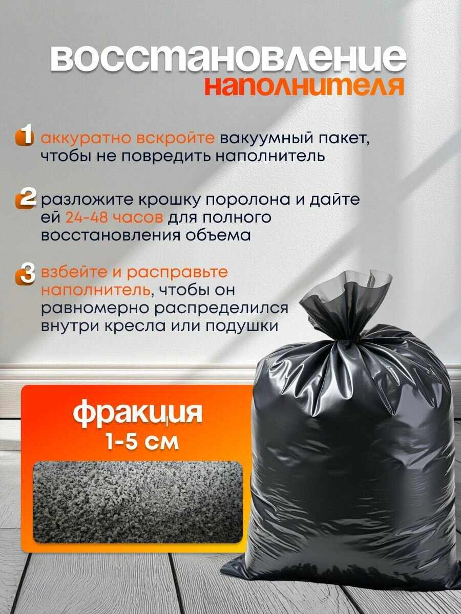 Наш наполнитель для кресла-мешка включает в себя высококачественную поролоновую крошку, которая обеспечивает отличную поддержку и долговечность. Поролоновая крошка в составе наполнителя помогает сохранить форму кресла, предотвращая его деформацию и обеспечивая комфортное использование на протяжении длительного времени. Благодаря поролону, ваш кресло-мешок будет оставаться упругим и удобным, создавая идеальные условия для отдыха и расслабления.