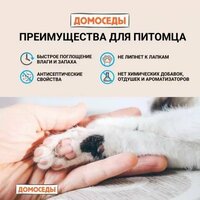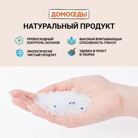 Какие виды наполнителей существуют? Как приучить кошку к лотку? Читайте в статье: «Как приучить котенка к лотку» — читать. Наполнитель Домоседы силикагель – наполнитель с кристаллами силикагеля в составе, которые обладают мощной впитывающей способностью и эффективно удерживают запах. Натуральный абсорбент, абсолютно безопасный для животных и людей, не прилипает к лапам и шерсти кошки, не образует комков. При правильном использовании на сегодняшний день один из самых эффективных наполнителей, обеспечивающих самую надежную нейтрализацию запаха. Применение: Заполните чистый лоток или закрытый туалет наполнителем слоем не менее 4 см. Не добавляйте в лоток наполнители из другого сырья. После использования наполнителя животным удалите экскременты при помощи совка, перемешайте кристаллы силикагеля при помощи совка. Досыпьте слой наполнителя до высоты 5 см, слегка встряхните лоток. Необходимо ежедневно перемешивать наполнитель для равномерного распределения свежих кристаллов и сохранения его эффективности. При работе с наполнителем используйте перчатки. Рекомендуется ежедневно перемешивать содержимое лотка при помощи специального совка для обеспечения равномерного впитывания жидкости. Полностью замените наполнитель в кошачьем туалете через 3-4 недели использования. Преимущества домоседыудобная экономичная упаковка с ручкой. Каждый кристалл наполнителя моментально впитывает жидкость и поглощает неприятные запахи. Поэтому при использовании наполнителя воздух и окружающая среда в доме будут оставаться свежими и чистыми. Специально разработанные размер и форма кристаллов наполнителя не допускают его прилипания к шерсти и лапам животного. Во время уборки наполнитель не прилипает к лотку и совку. Наполнитель домоседы – натуральный, нетоксичный, экологически чистый продукт, безопасный для животных и окружающей среды. Важно знать! Запрещено утилизировать остатки наполнителя и отходы в канализацию!