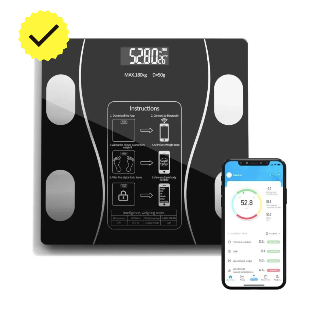 | Дополнительные функции | измерение температуры воздуха, определение доли воды, определение доли жировой ткани, определение доли костной ткани, определение доли мышечной ткани, память, постановка цели, расчет ИМТ (BMI) |