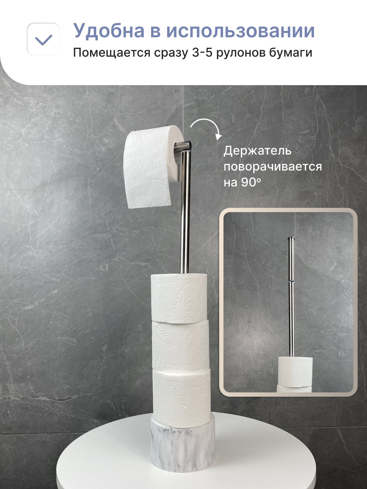 - Компактность и функциональность: Несмотря на свою компактную конструкцию, стойка способна вместить до 4 рулонов туалетной бумаги, обеспечивая удобство использования и экономию места в вашей ванной комнате.