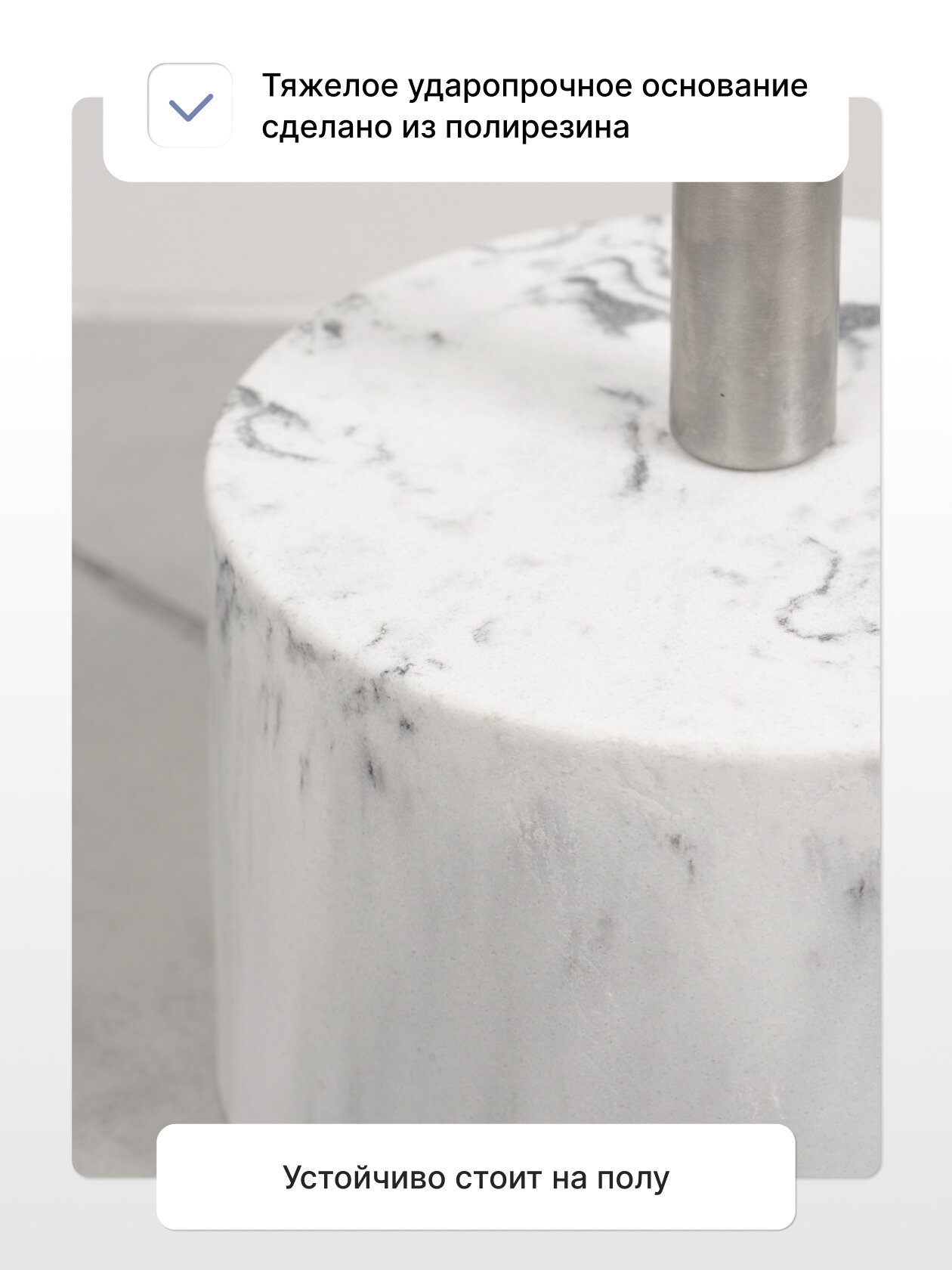 - Стильный дизайн: Напольная стойка притягивает внимание своим современным и изысканным дизайном. Матовое полимерное покрытие и хромированные элементы придает ей элегантный вид, который подчеркивает стиль вашего помещения.