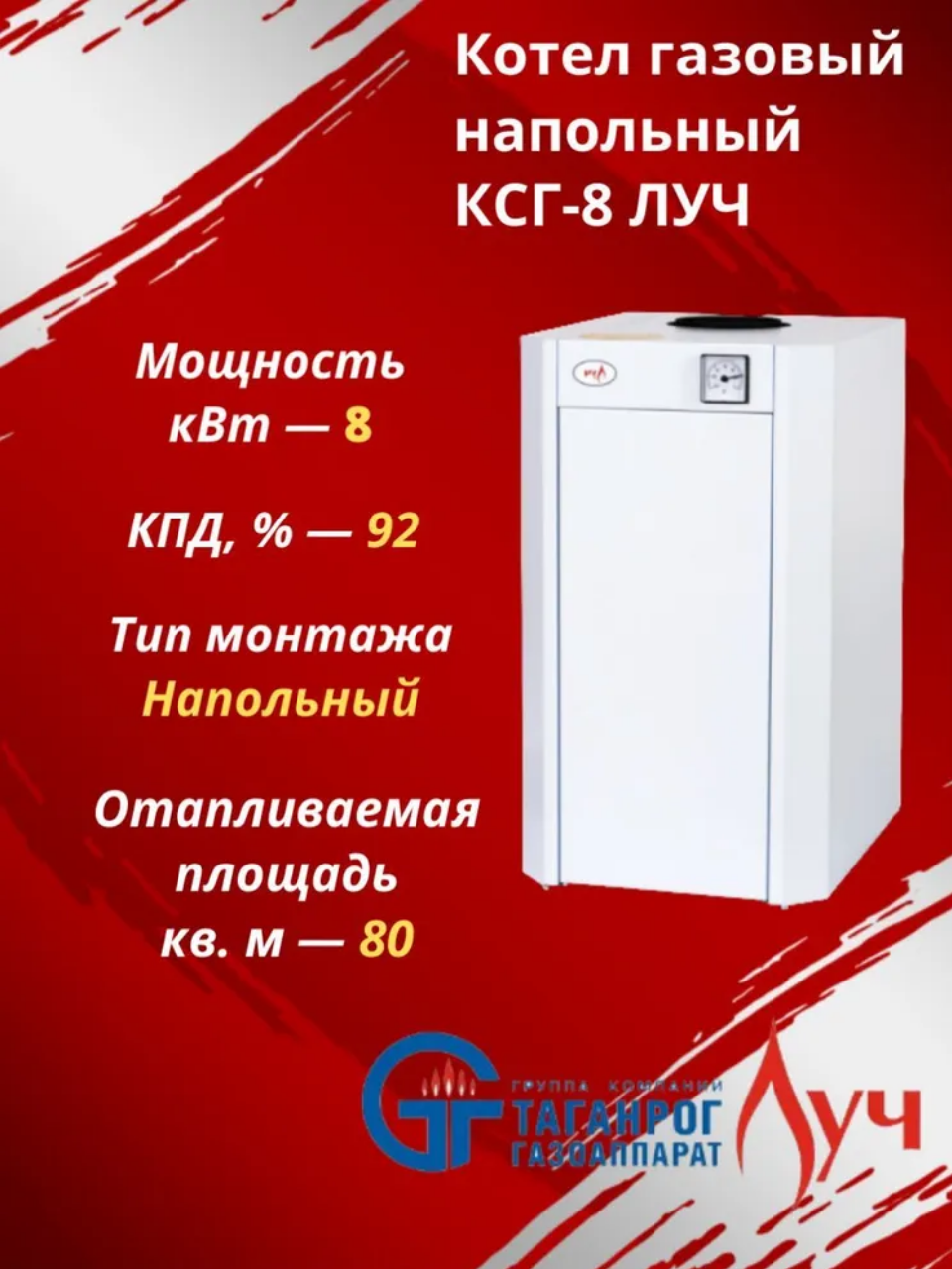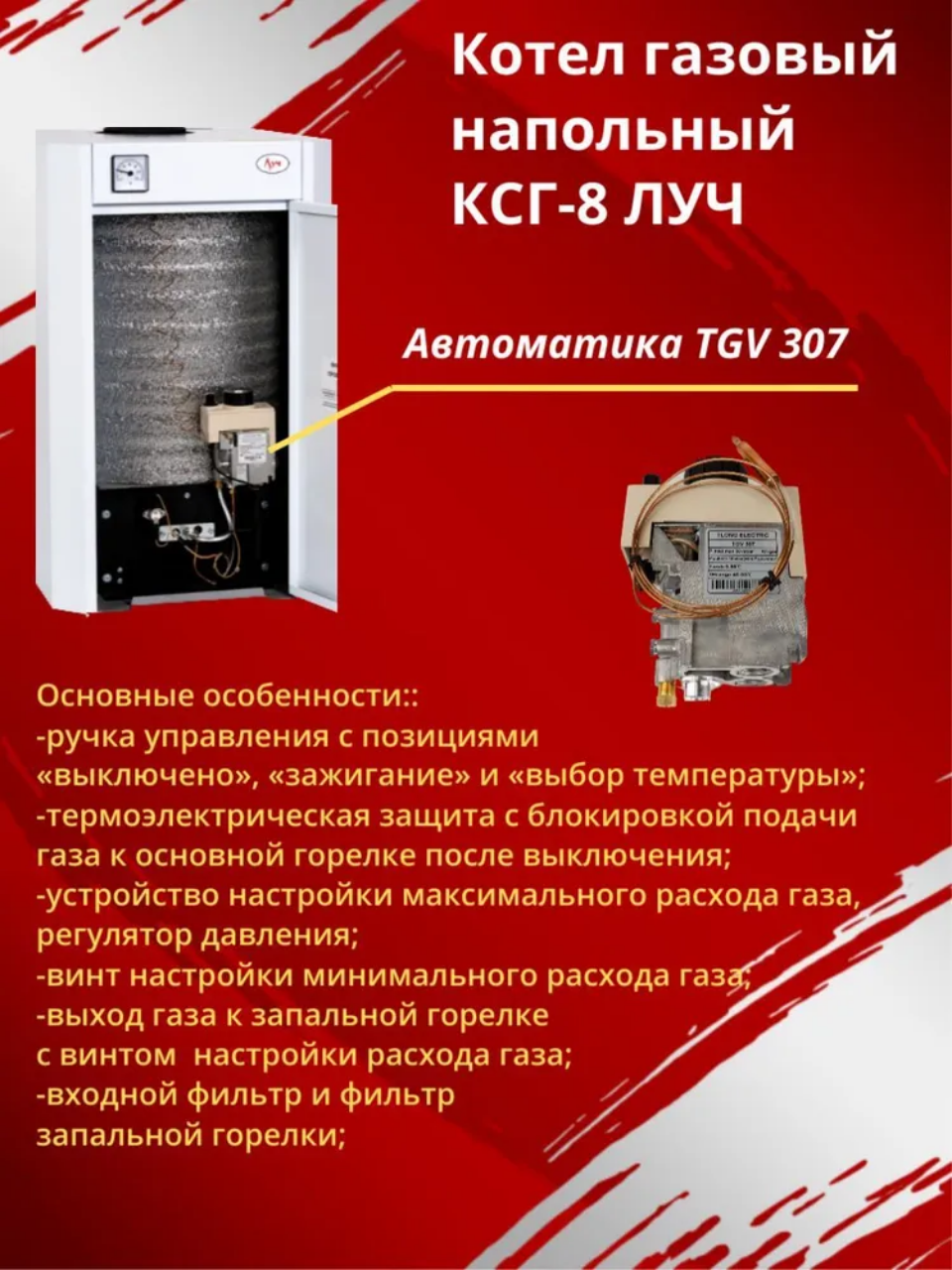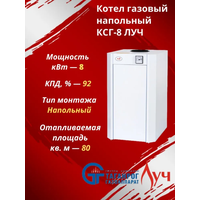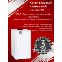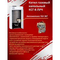 ЛУЧ КСГ-8 относится к оборудованию с открытой камерой сгорания, работает в открытых и закрытых системах отопления, поддерживает естественную циркуляцию теплоносителя, работает в отопительных сетях с принудительной циркуляцией, не требует дополнительной установки дымососов и вентиляторов. Перед подачей на горелку газ проходит через фильтр-сетку автоматики. Фильтр позволяет задерживать частицы пыли и мусора, защищая жиклеры горелки от засорения. Котел оснащен низкопламенной горелкой коврового типа – одной из самых эффективных. Количество жиклеров в ней увеличено, а диаметр, напротив, уменьшен. Это позволяет сократить расход газа и одновременно обеспечить равномерный прогрев топочной камеры и теплообменника, что увеличивает эффективность работы и повышает надежность котлов. Особенности и преимущества: