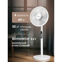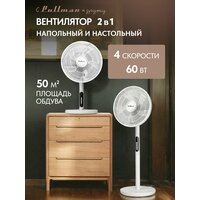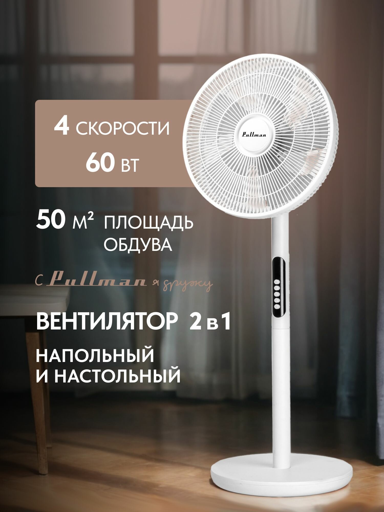 Купить Напольный и настольный вентилятор 2 в 1 PULLMAN PL-600, электрический, мощность 60 Вт, 4 скорости, стильный дизайн, белый с доставкой по всей России.