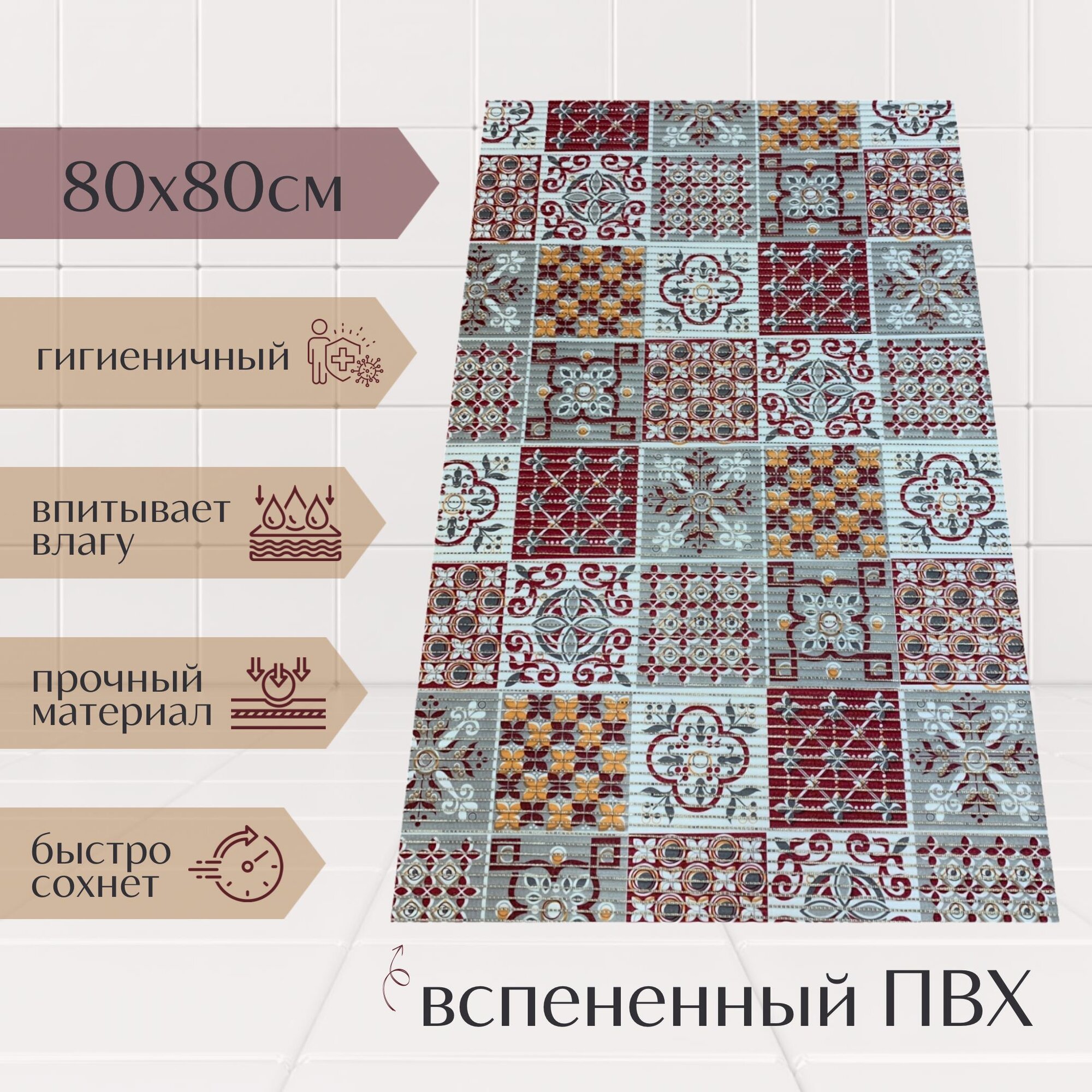 Напольный коврик для ванной из вспененного ПВХ 80×80 см, бордовый/серый/белый, с рисунком: сравнение цен, характеристики, фото, актуальное наличие и цены.