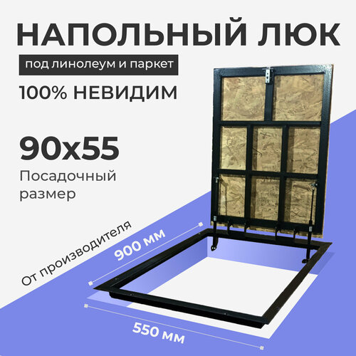 Особенности конструкции: невидимка, одностворчатый, с амортизаторами, с уплотнителем с 3-х сторон, петли по узкой стороне, самоподъемный, скрытый монтаж. Обеспечивает доступ к инженерным коммуникациям в полу (а также подвалам и погребам).