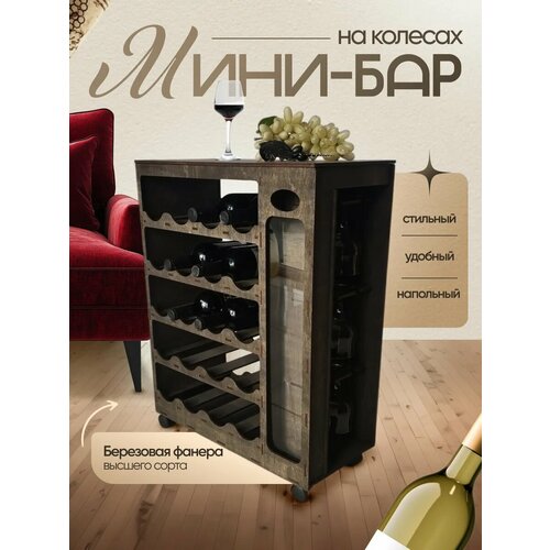 Напольный мини бар на колесах – это удобное и стильное решение для создания домашнего уголка для приготовления напитков. Этот компактный барный столик на колесах позволяет легко перемещать его по дому, чтобы всегда иметь возможность приготовить любимый коктейль или напиток. Вмещает до 20 бутылок и 6 бокалов. Имеет копилку для пробок. Современный дизайн и качественные материалы обеспечивают долговечность и износостойкость. Благодаря удобным колесицам, бар можно легко перемещать, не беспокоясь о повреждении полов. Мини бар на колесах – идеальное дополнение для кухни, гостиной или даже террасы, добавляя уют и функциональность вашему дому.