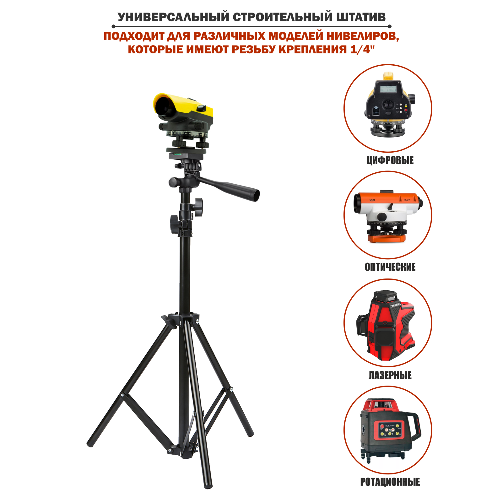 Трипод оснащен универсальным креплением, совместимым с большинством лазерных уровней и нивелиров на рынке.