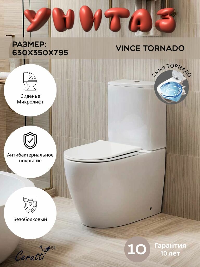 Напольный унитаз Ceruttispa VINCE Tornado (630х350х795) торнадо, безободковый, микролифт, белый: сравнение цен, характеристики, фото, актуальное наличие и цены.