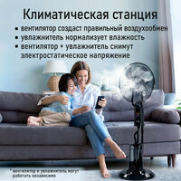 Напольный вентилятор с увлажнителем воздуха и пультом, 5 лопастей, d=16"/40см, 100 Вт, функция увлажнения, пульт ДУ, LED индикация, высота 1,28м, 3 скоростных режима, 3 режима обдува, функция поворота, таймер до 7,5 часов, регулировка наклона, безопасная решетка, регулировка степени увлажнения• 3-лопастной напольный диаметром 40 см. с функцией увлажнения воздуха, пультом дистанционного управления, LED индикацией выбранных настроек, тремя режимами работы, устойчивой подставкой, высококачественной защитной решеткой и мощностью 90 Ватт создает приятный поток охлаждающего воздуха.• Увлажнителем воздуха можно пользоваться как совместно с вентилятором, так и отдельно в течение всего года, обеспечивая комфортный микроклимат в доме• Прибор имеет регулировку интенсивности увлажнения для поддержания желаемой влажности в помещении и автоматически выключится, если в резервуаре емкостью 3 литра закончится вода.• С помощью пульта ДУ удобно управлять вентилятором и функцией увлажнения воздуха на расстоянии.• Низкий уровень шума и 3 скорости работы обеспечивают скорейшее достижение комфортных условий в душном помещении, а функция регулировки наклона позволит оптимально настроить поток воздуха.• Может работать как в фиксированном положении, так и с поворотом относительно своей оси, что существенно увеличит площадь обдува.• Два дополнительных режима работы вентилятора: - «Природный» имитирует настоящий природный ветер, - «Ночной» автоматически меняет силу потока воздуха.• Встроенный таймер позволит запрограммировать время вплоть до 7,5 часов.• Постоянная циркуляция воздуха в комнате, либо офисе дарит ощущение свежести, способствует лучшему тонусу и отличному настроению в течение всего дня, а ночью – крепкому сну и быстрому восстановлению сил.• Надежные компоненты вентилятора обеспечат долгий срок службы без каких-либо проблем. Климатическая техника для дома бытовая техника - удобный гаджет для дома. Вентилятор напольный - устройство для охлаждения воздуха в помещении.