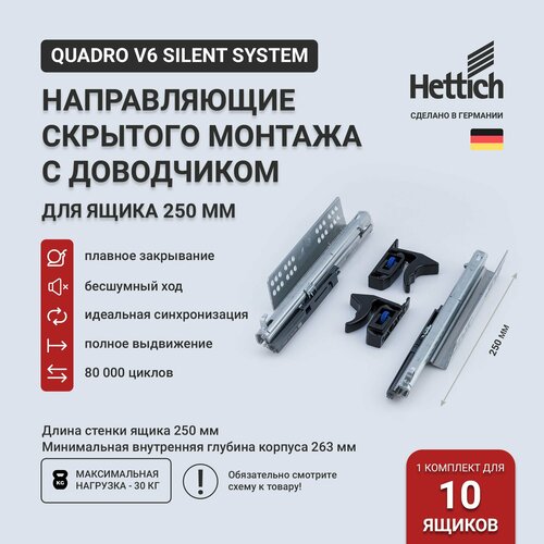 Купить Направляющие для ящиков Hettich Quadro V6 Silent System с доводчиком, длина 250 мм, полное выдвижение, скрытый монтаж с доставкой по всей России. Направляющие для ящиков Hettich Quadro V6 Silent System с доводчиком, длина 250 мм, полное выдвижение, скрытый монтаж: сравнение цен, характеристики, фото, актуальное наличие и цены.