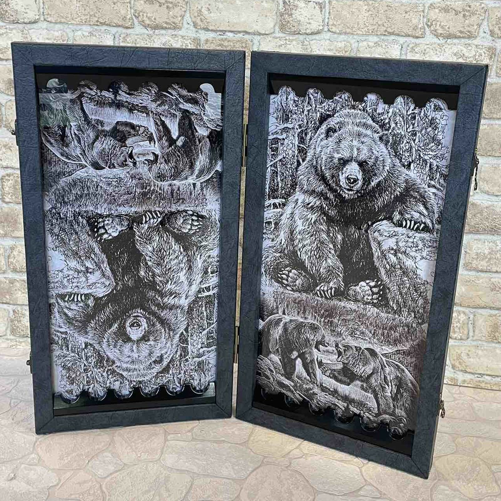 Нарды большие стеклянные "Яростный Медведь" с усиленными углами. Нарды большие деревянные 60 на 60 обтянутые качественной экокожей премиум класса и с двойным каленым стеклянным игровым полем, очень прочное. Материал изготовления нард: натуральное дерево(липа), экокожа премиум класса, двойное качественное каленое стекло (очень прочное - нет повода беспокоиться о хрупкости), рисунки качественная шелкография, надежные крепления петли металл.