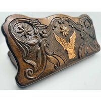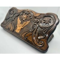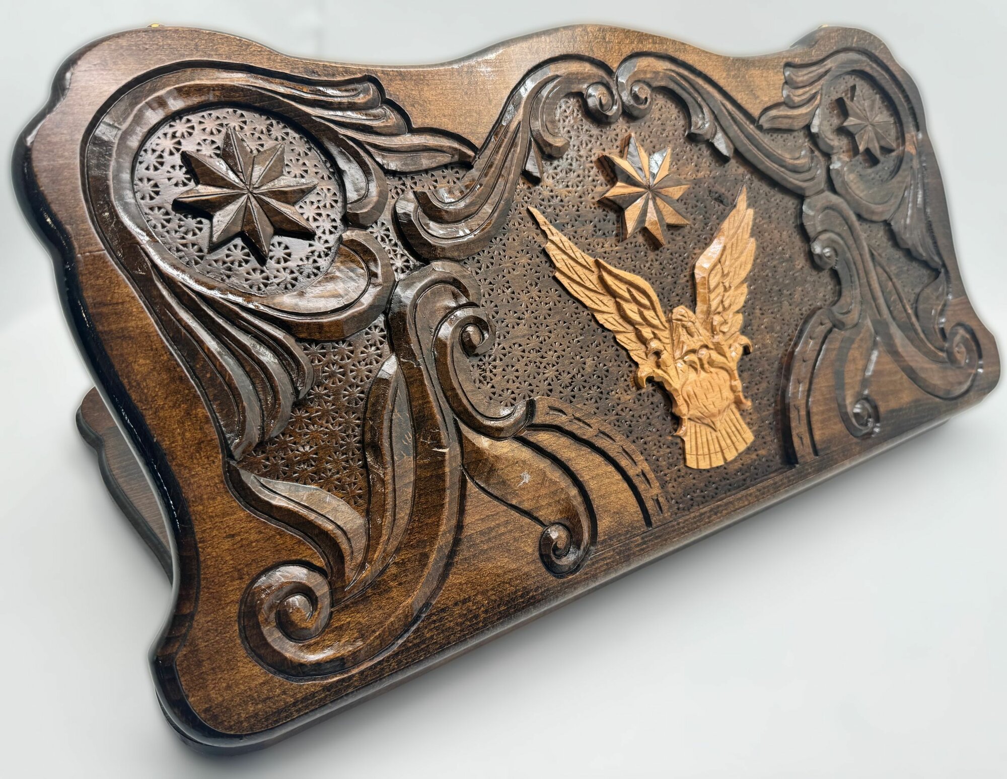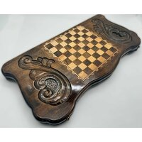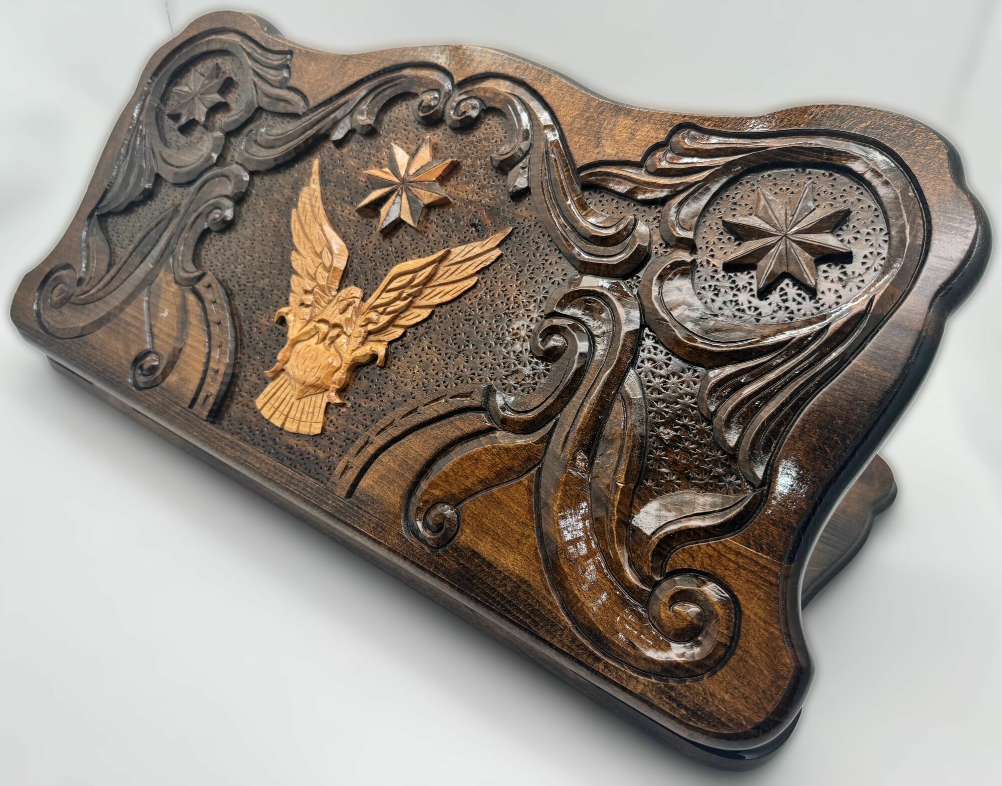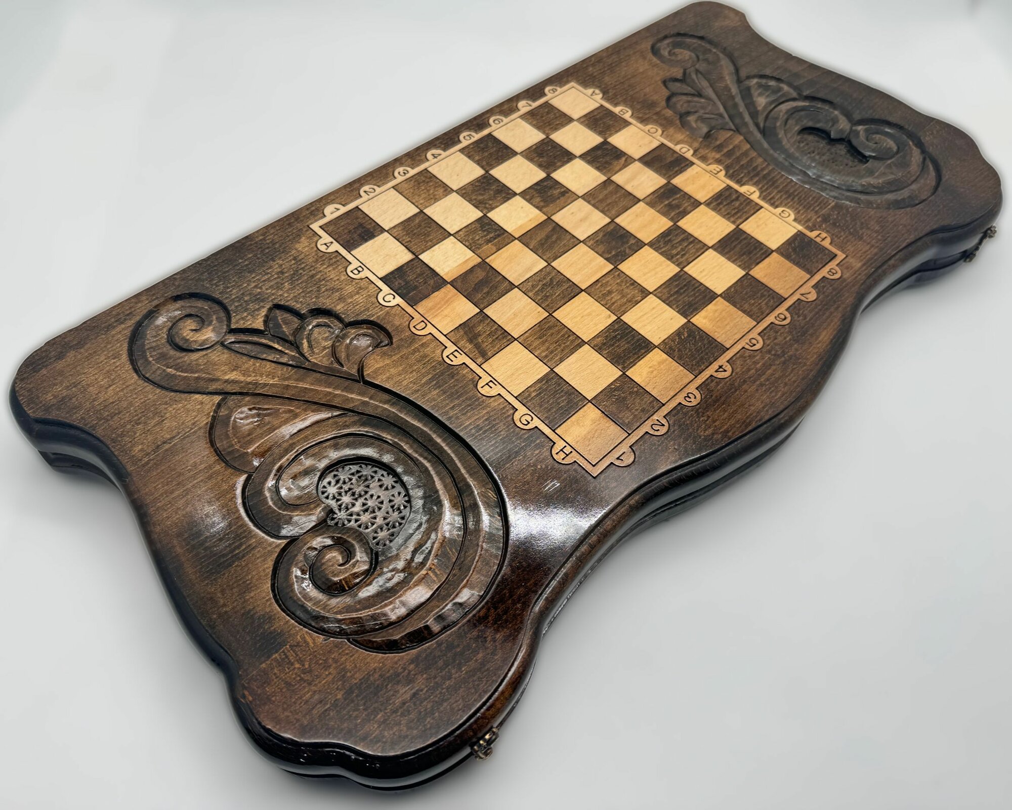 Нарды Деревянные Брутальные "Властелин Неба" большие премиум сегмента, ручная работа. Нарды изготовлены из качественного, прочного и долговечного дерева Бук, лакированные. Петли и замки дизайнерские из бронзы. Есть лунки для хранения фишек и зариков. Фишки резные из бука, ручной работы, с подложкой. В комплекте доска, игральные кости высокого качества, фишки 32 шт (из ореховой древесины), сумка.