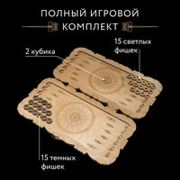 В состав набора входит: фишки, имеющие отверстие и бархатное покрытие, что обеспечивает идеальное скольжение по всей площади игровой зоны, игровая доска из березы высочайшего качества, покрытая финским лаком и качественные кубики.