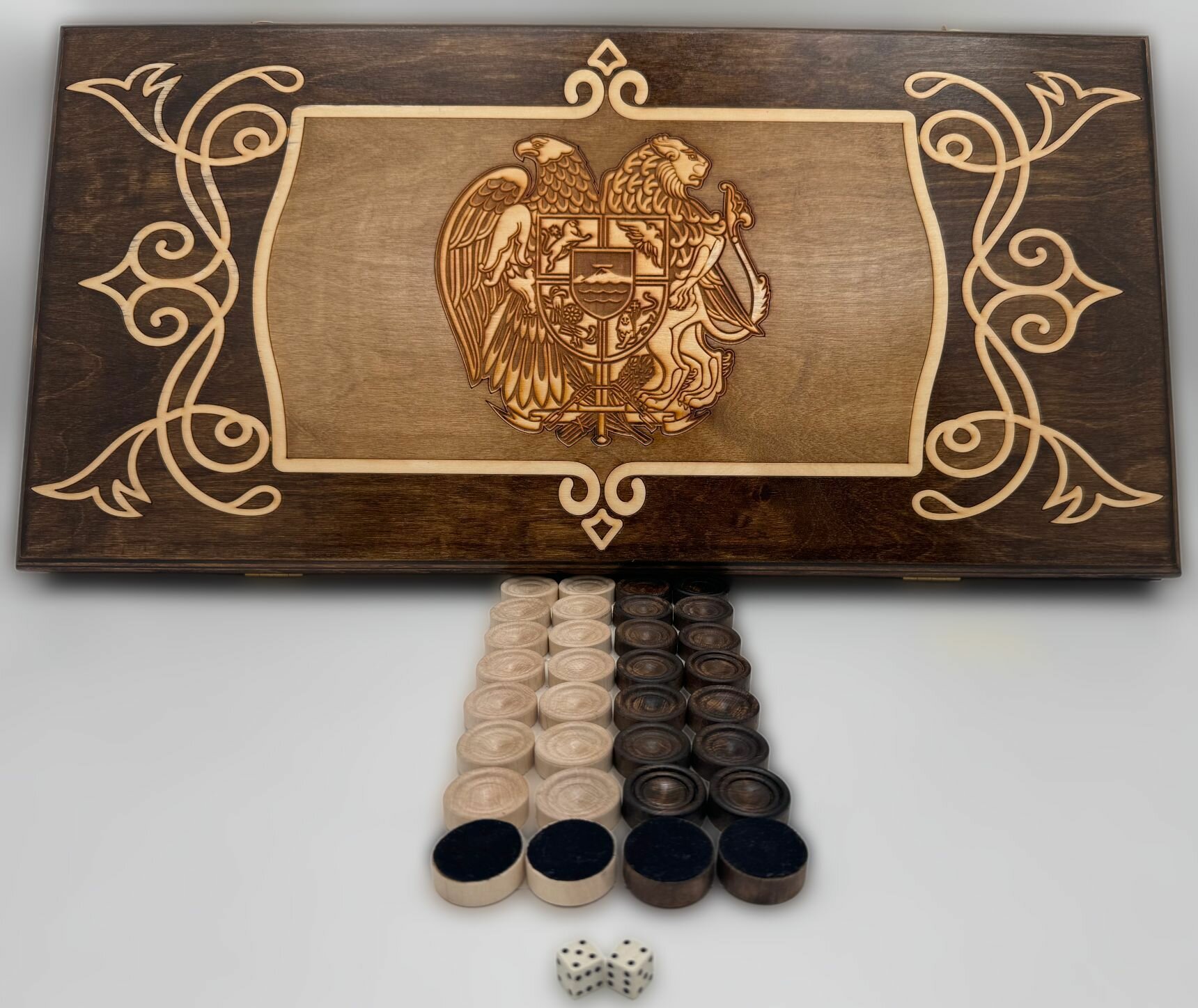 Нарды Деревянные Резные "Герб Армении" большие 60х60 см, изготовлены из дерева Бук. В комплекте доска, игральные кости высокого качества, фишки 32 шт деревянные с подложкой , сумка. Размеры в складном виде (Д(Ш/В) (см): 60/30/6; Материал: дерево (бук), фанера; Тип: нарды + шашки 2 в 1; В комплекте: доска для игры в нарды ручной работы, фишки, кости, чехол; Вес (кг): 3,0. Упаковка: сумка; Количество фишек (шт): 16 светлых, 16 темных; Диаметр фишки (см): 2.9; Поле для шашек и шахмат: есть; Фишки с подложкой: да; Кости (шт): 2; Размер клетки (см): 3.