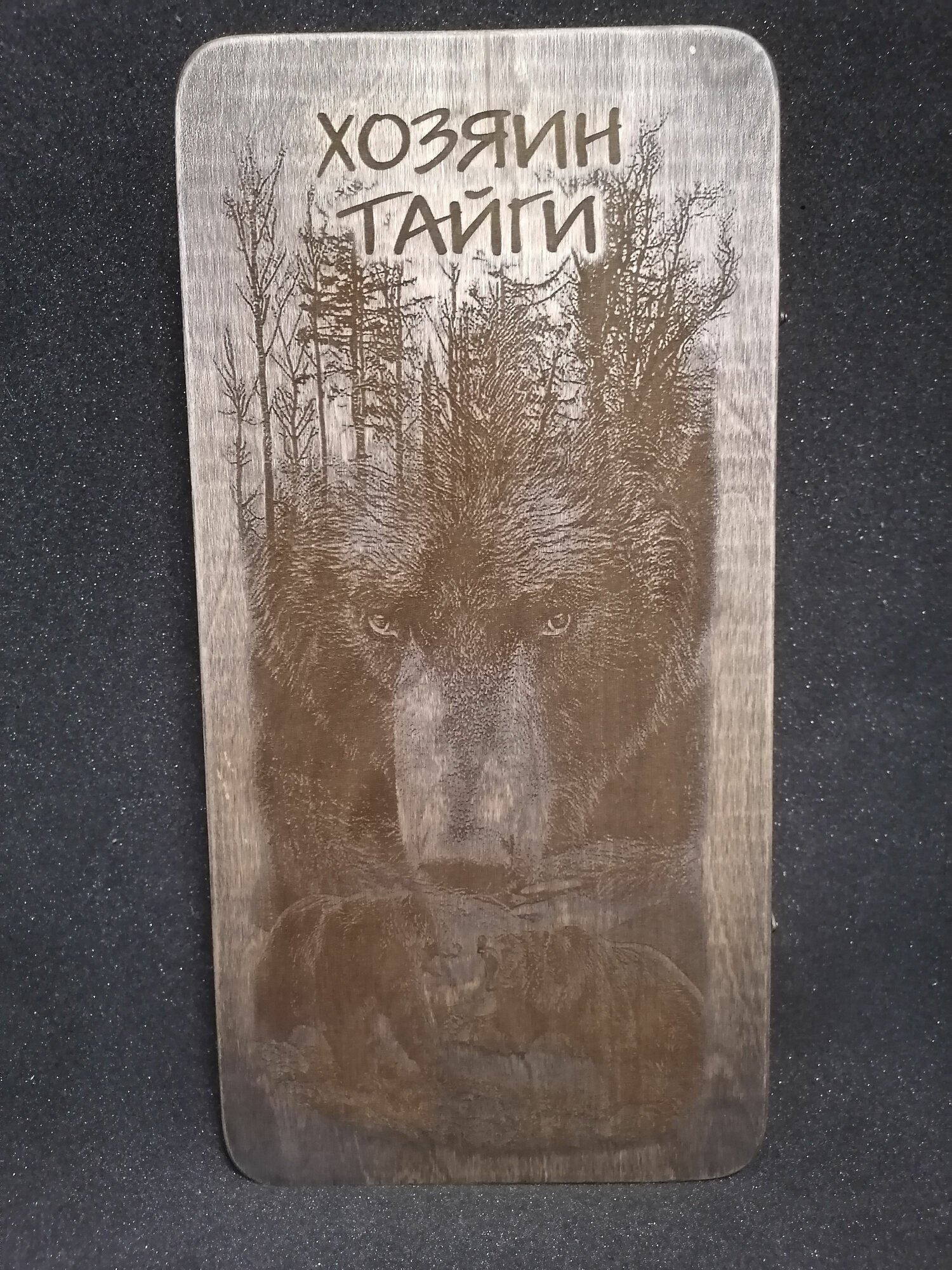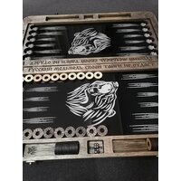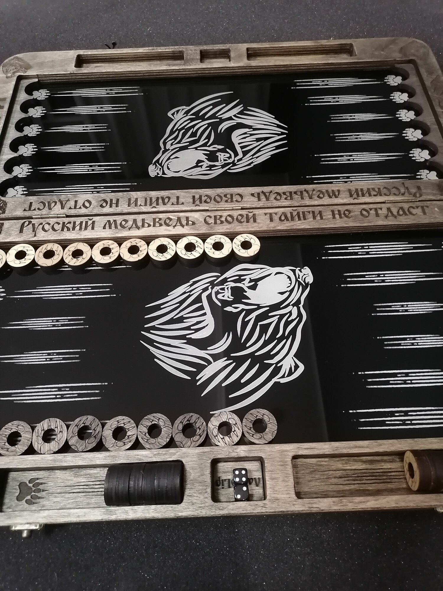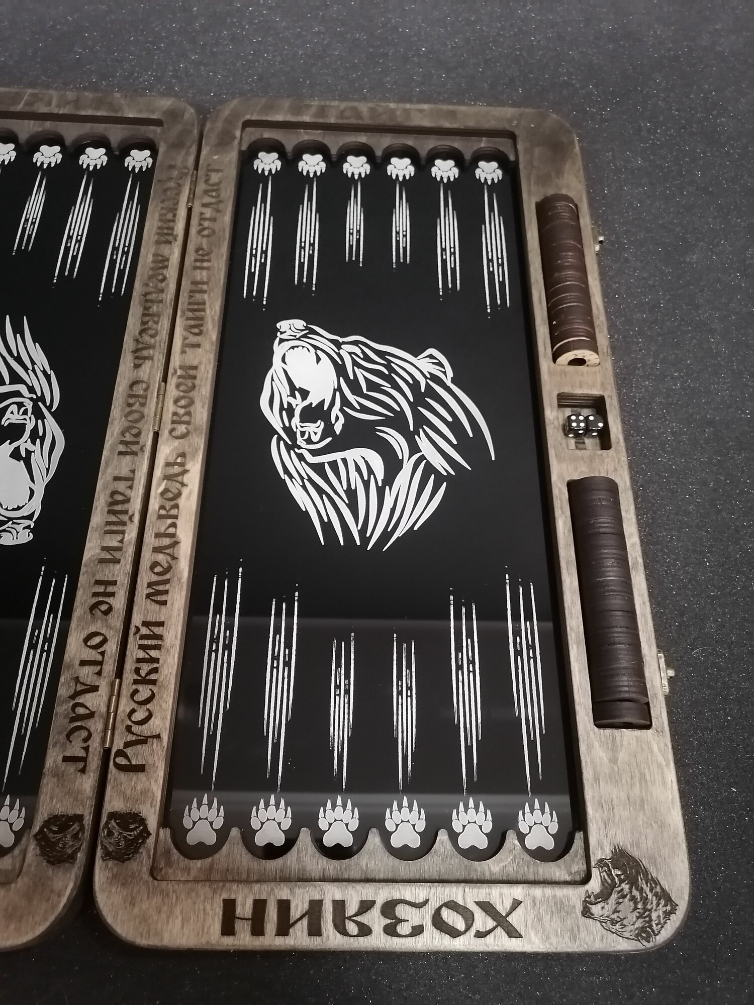 Нарды ручной работы с стеклянным игровым полем "Хозяин тайги" Размер 25х50 (в разложенном состоянии 50х50). Фишки в комплекте по 16 шт каждого цвета (по одной запасной), кубики в комплекте. Нарды и фишки покрыты маслом для дерева. Всё рисунки и надписи выполнены гравировкой. Нарды отлично подойдут в качестве оригинального подарка, а также для удивления и восторга Ваших гостей.