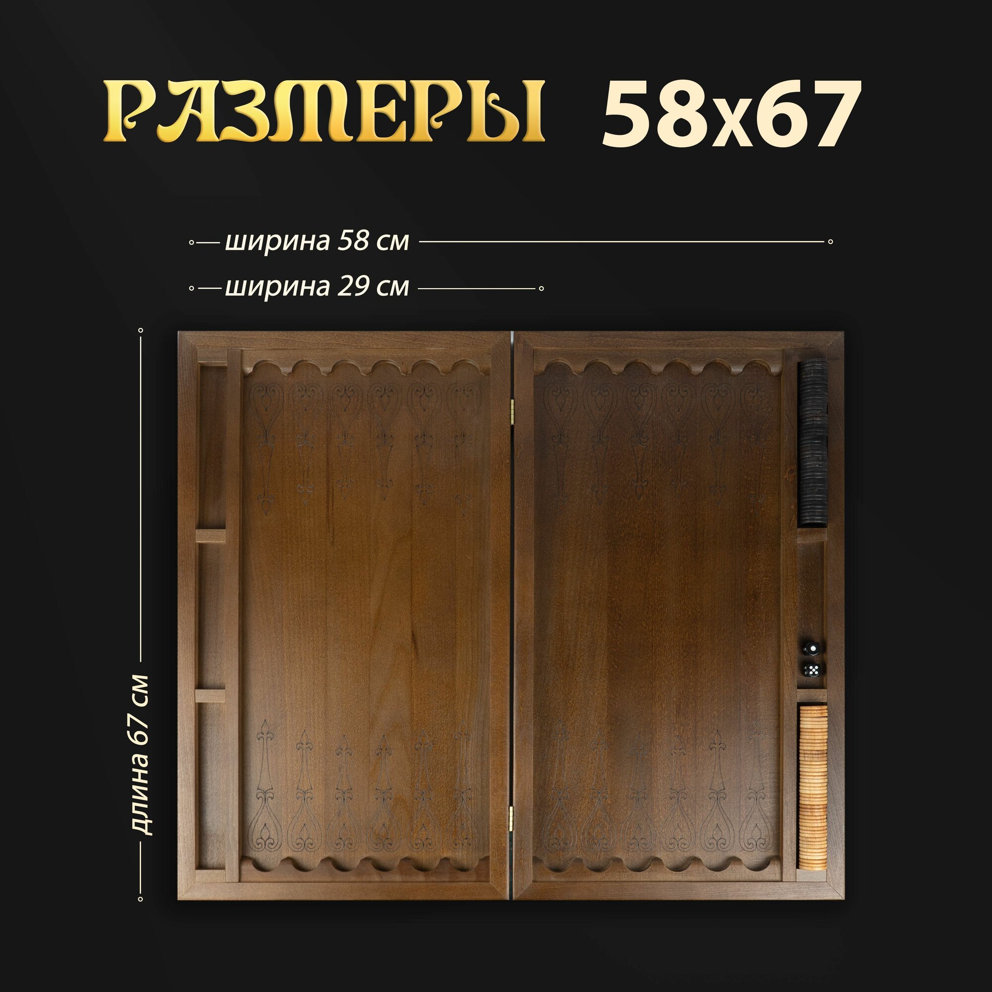Подарочные нарды / Нарды деревянные большие: доска, выступающая в качестве складной основы - шкатулки, и фигуры, выполнены из древесины массива бука, тонированы, лакированы. Доска украшена высококлассной резьбой. Подробные размеры: доска в сложенном виде 57х27х5 см, в разложенном - 57х56х2,5 см, игровое поле для нард - 2 отделения размером 51х21 см каждое, фишки - d 3 см.
