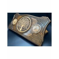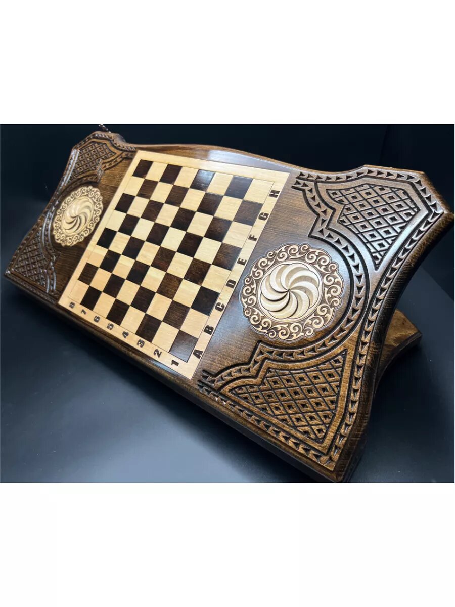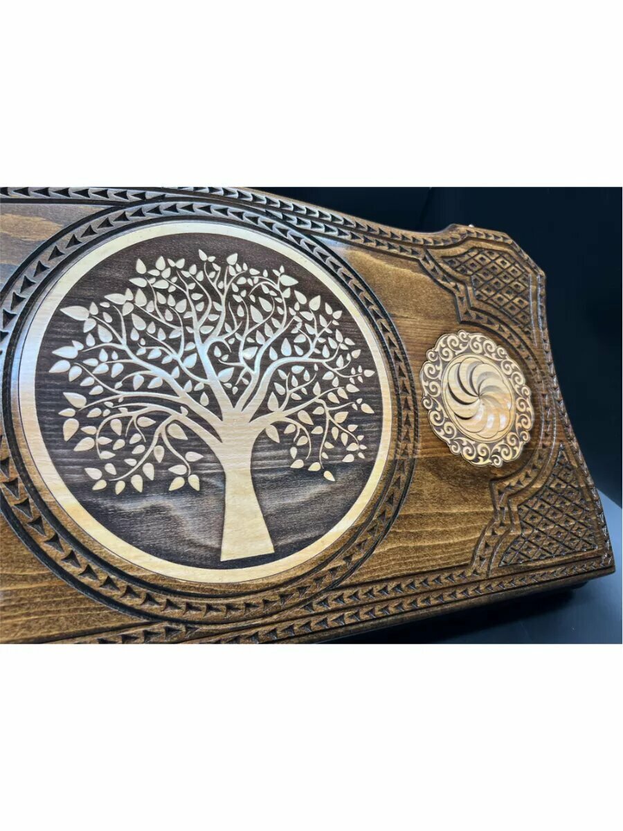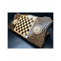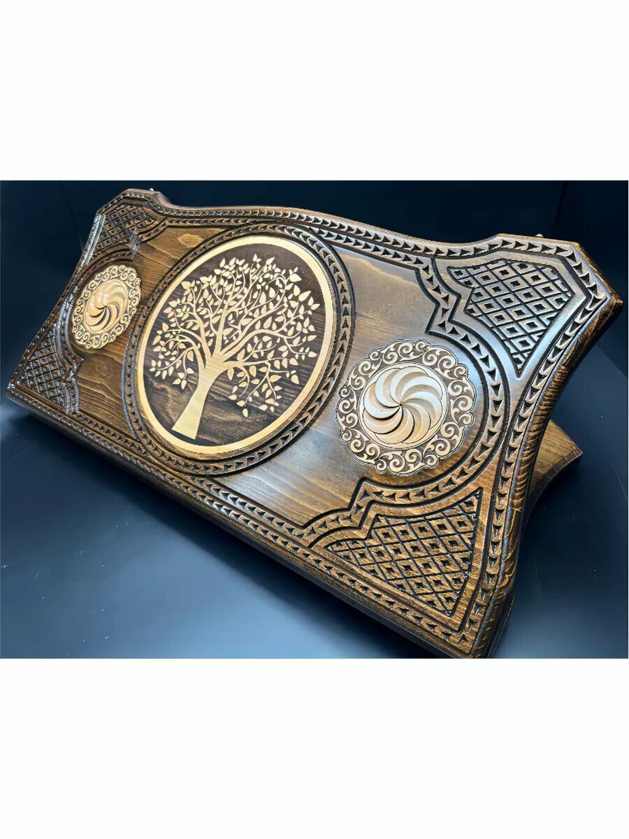 На нардах вырезано Древо Жизни, которое присутствует в мифологии всех народов, оно даёт представление о жизни во всех её смыслах. Наши древние предки язычники поклонялись не идолам и кумирам, а священным деревьям, многие из которых дожили до нашего времени. Сроки таких деревьев превышают человеческие жизни. К таким древам относят Дуб, Иву, Лиственницу, Сикомору, Явор, Кедр, Баньян и Баобаб. Данная модель представлена в максимальной комплектации: петли и замки дизайнерские из Бронзы, внутренняя сторона в двухцветном исполнении, также есть лунки для хранения фишек и зариков. Изделие изготовлено из качественного, прочного и долговечного дерева Бук, лакированное. Вес: 4,7 кг; Материал Бук; Состояние Новое; Упаковка Чехол; Страна: Армения, РФ, Диаметр Фишки (см) 2,9; Поле для шашек, Есть; Размер клетки для шашек 2,5 (см); Фишки с подложкой Да; Кости (шт) 2; Исполнение Резные; Ложемент для хранения фишек (лунки) Есть; Размер в закрытом состоянии (Д x Ш x В) (см) 60х30х6; Размер в открытом состоянии (Д x Ш x В).