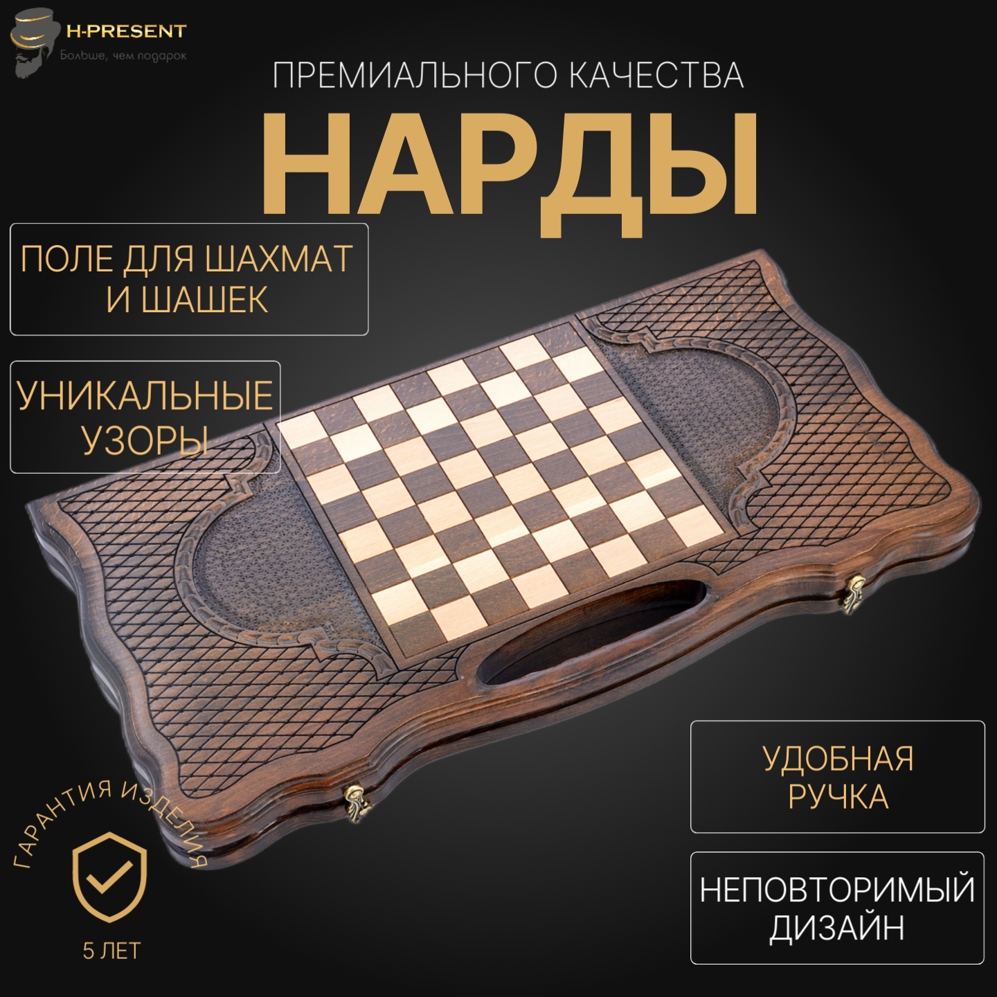 В комплекте: резная доска для игры в нарды; фишки из бука ручной работы с текстильной подкладкой по 16 шт. светлых и темных (по одной запасной на каждый цвет); кости из бильярдного шара ручной работы; текстильный чехол-сумка - полный набор как для игры, так и для подарка!