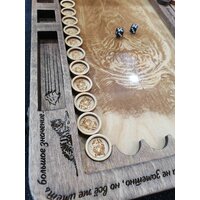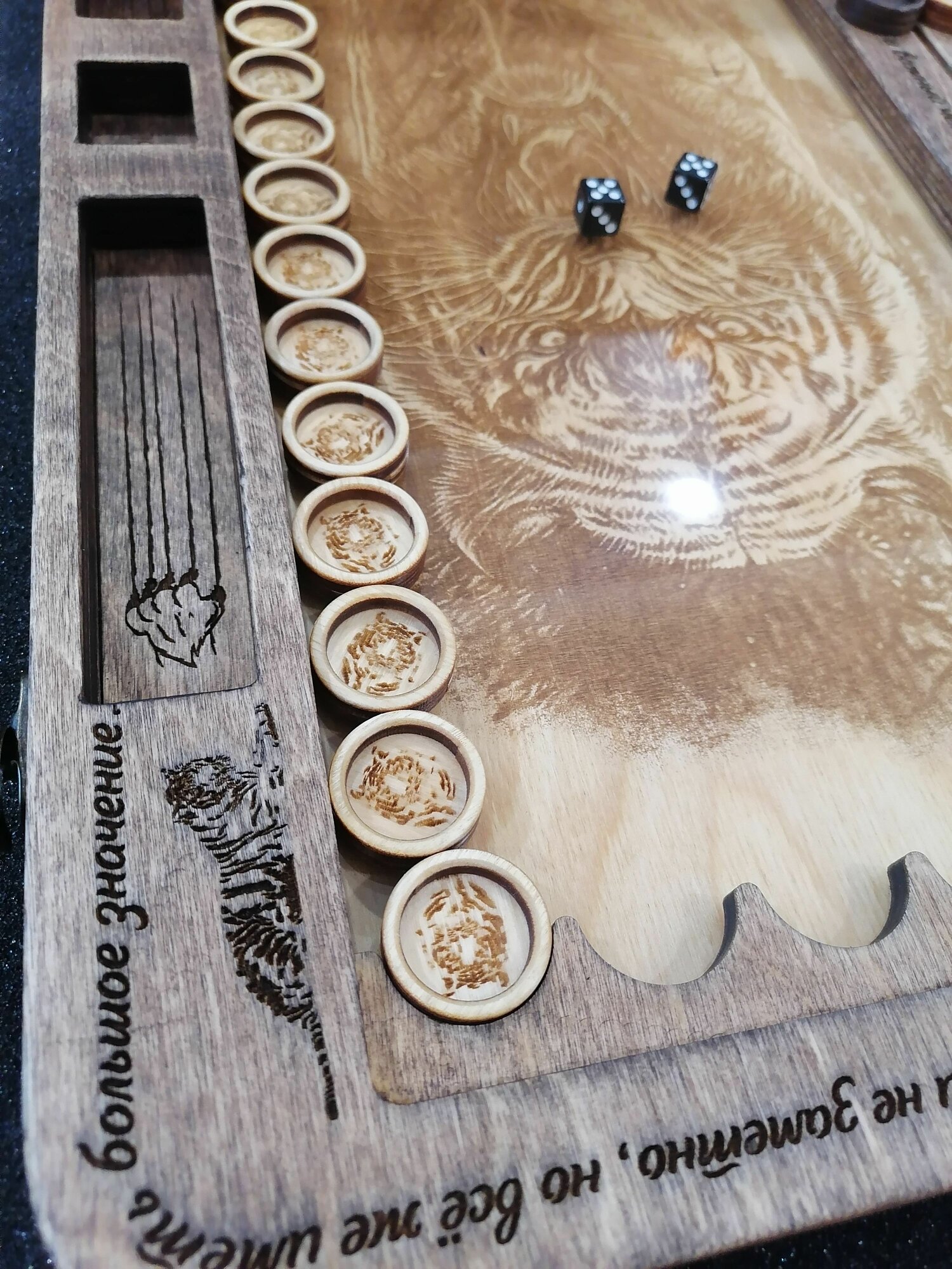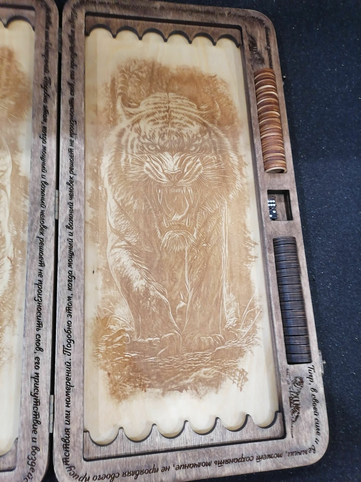 Нарды ручной работы с стеклянным игровым полем "тигр" "Любимому мужу и Лучшему папе", "Мечтай! Улыбайся! Наслаждайся! Каждым мгновением! " Размер 25х50 (в разложенном состоянии 50х50). Фишки в комплекте по 16 шт каждого цвета (по одной запасной), кубики в комплекте. Нарды и фишки покрыты маслом для дерева. Всё рисунки и надписи выполнены гравировкой. Нарды отлично подойдут в качестве оригинального подарка, а также для удивления и восторга Ваших гостей.
