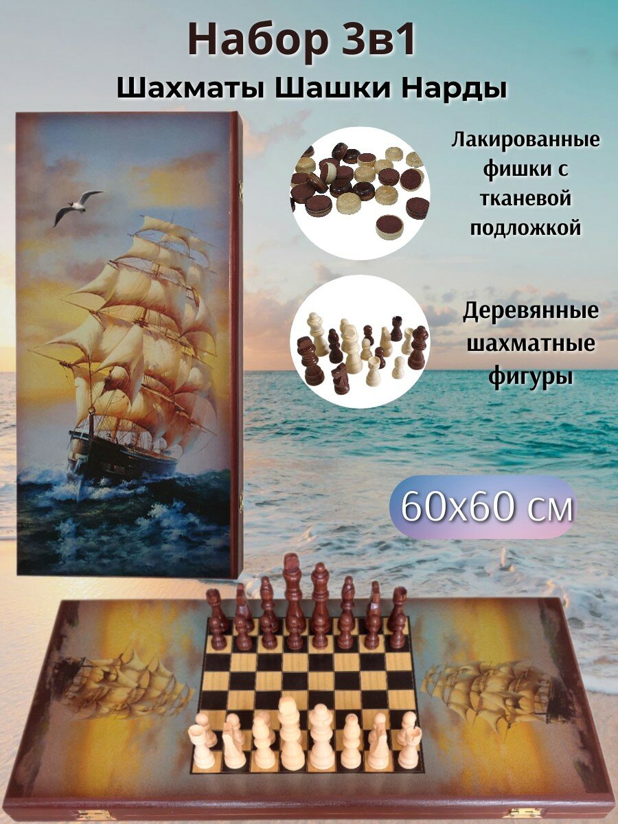 Представляем вашему вниманию набор игр шахматы, шашки, нарды "Парусник" — идеальный выбор для любителей настольных игр. Этот набор игр шахматы, шашки, нарды станет отличным подарком мужчине на день рождения, Новый год, 23 февраля или любой другой праздник.