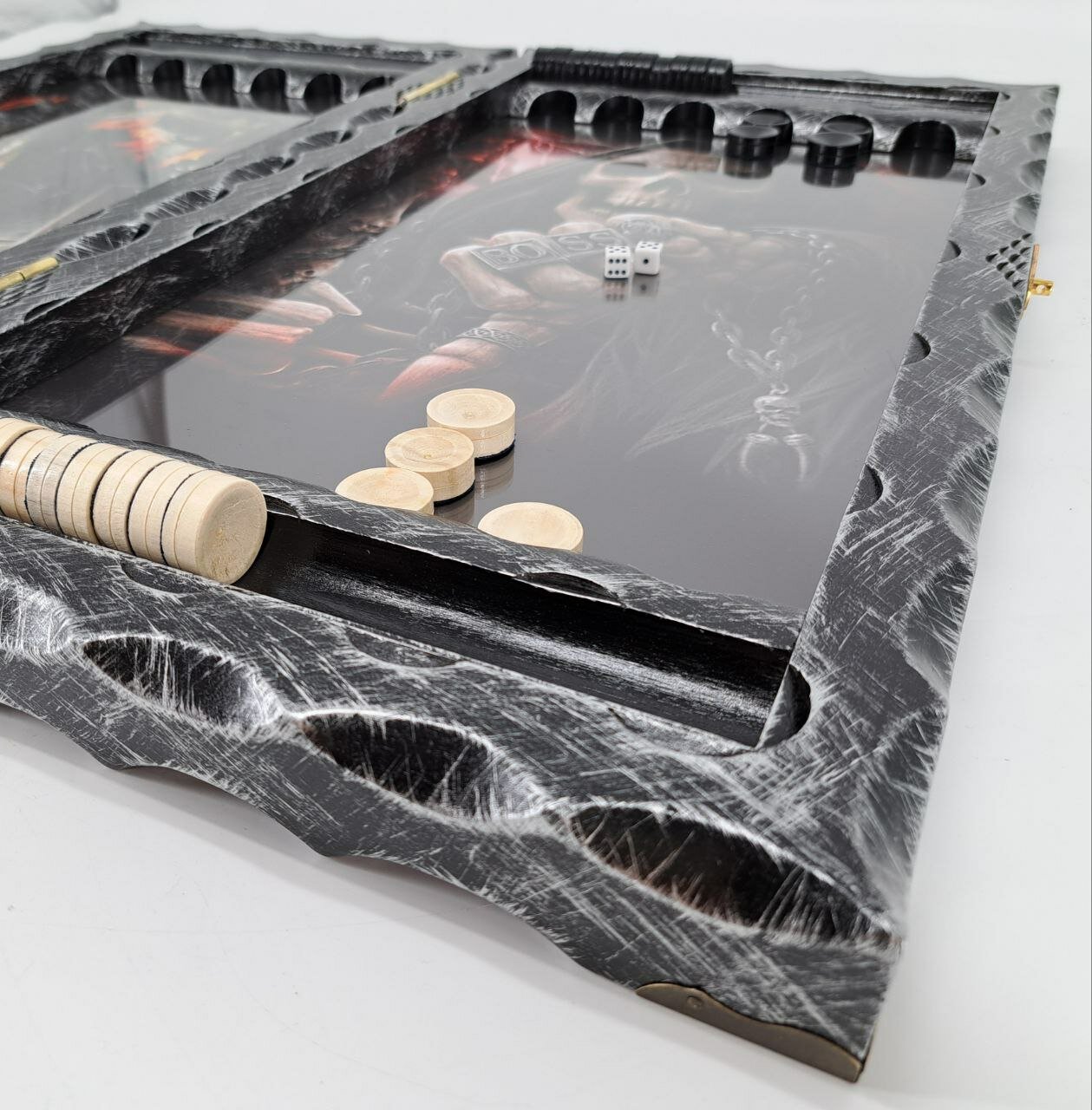 Роскошные, стилизованные нарды, выполнены в стиле традиционных лагерных работ! Деревянная рамка, бар для фишек, игровые ячейки для фишек! Нарды декорированы черной краской с нанесением серебрянных и золотых штрихов, придающих изделию металлический блеск и массивность. Нарды имеют внушительный размер 63*33 см и толщину 9 см в сложенном виде! Сочетание провокационных рисунков на обложках и внутри, придают нардам притягательный, зловещий оттенок! Подарите имениннику эти нарды и вы получите незабываемый восторг в глазах нового владельца этих роскошных нард!