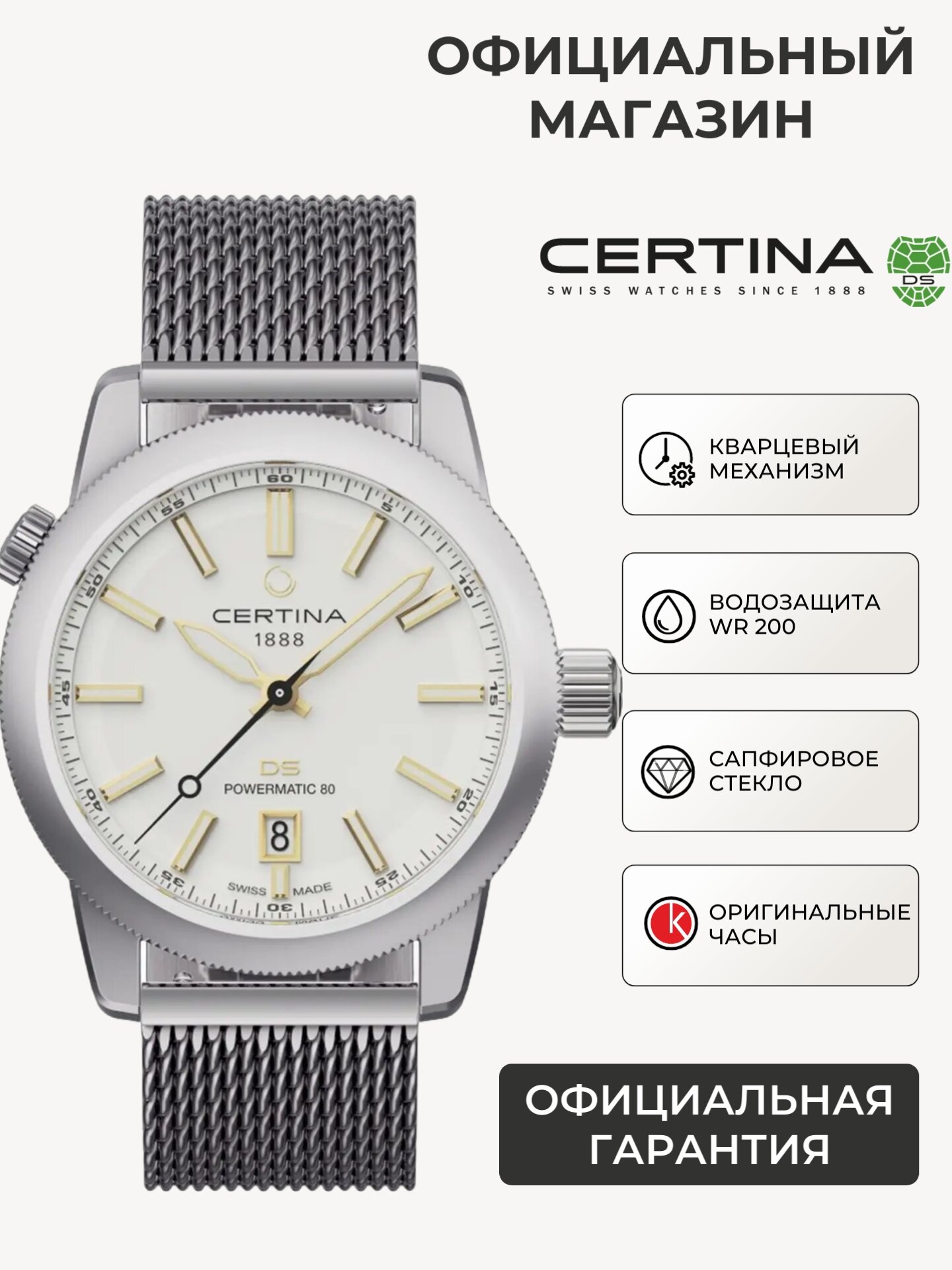| Дополнительная информация | Модуль механизма Certina DS+ с циферблатом C041.407.19.031.91 круглой формы комбинируется с корпусами из нержавеющей стали и надежно закрепляется с помощью заводной головки на корпусе. |