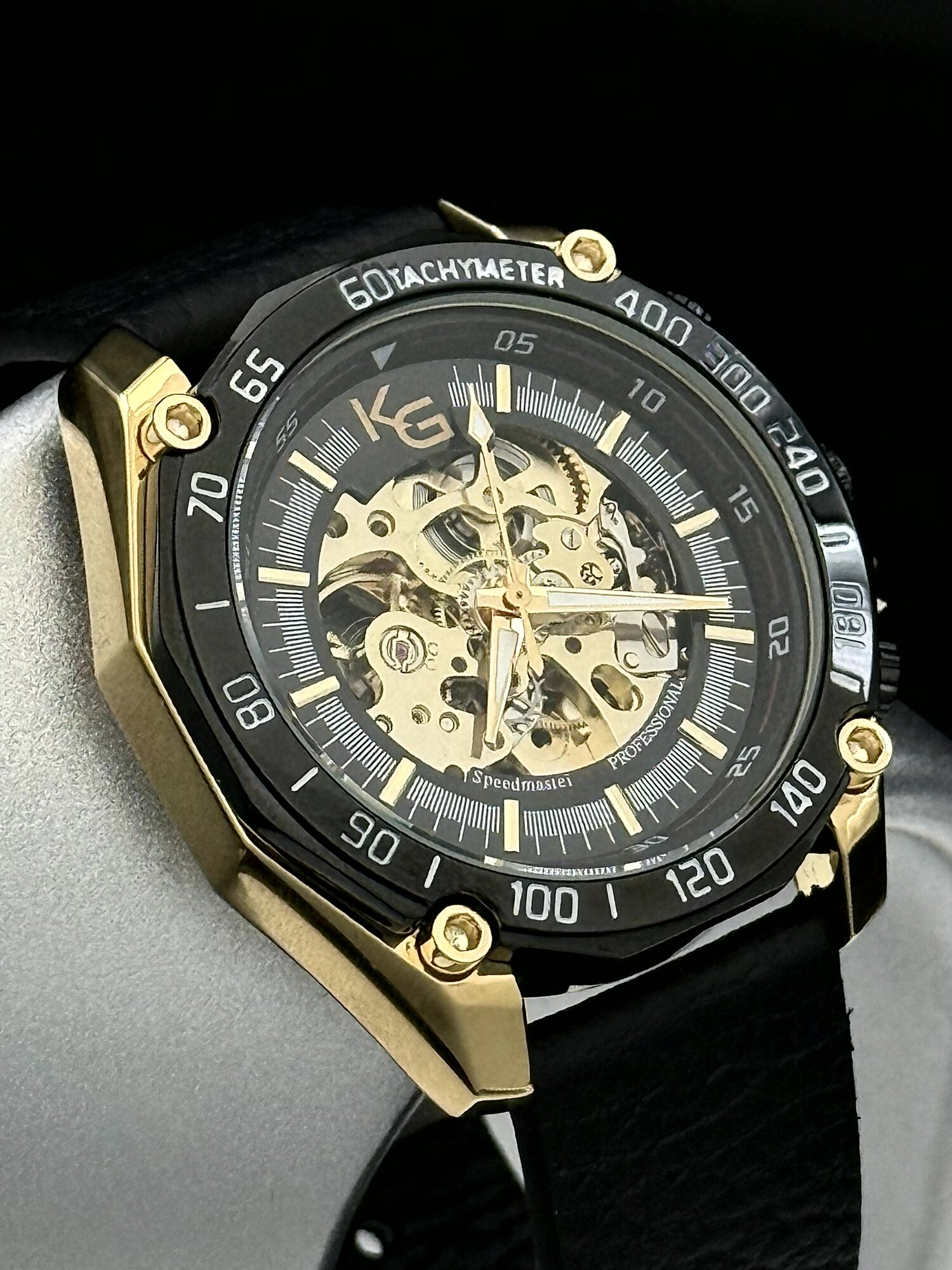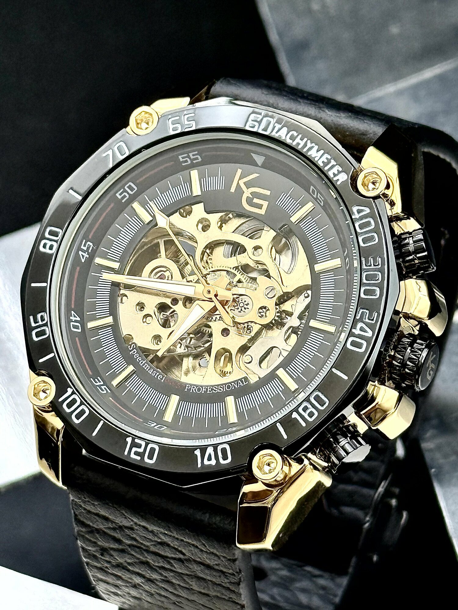автоподзавод, антибликовое покрытие стекла, бесшумный механизм, подсветка стрелок, прозрачный корпус, скелетон