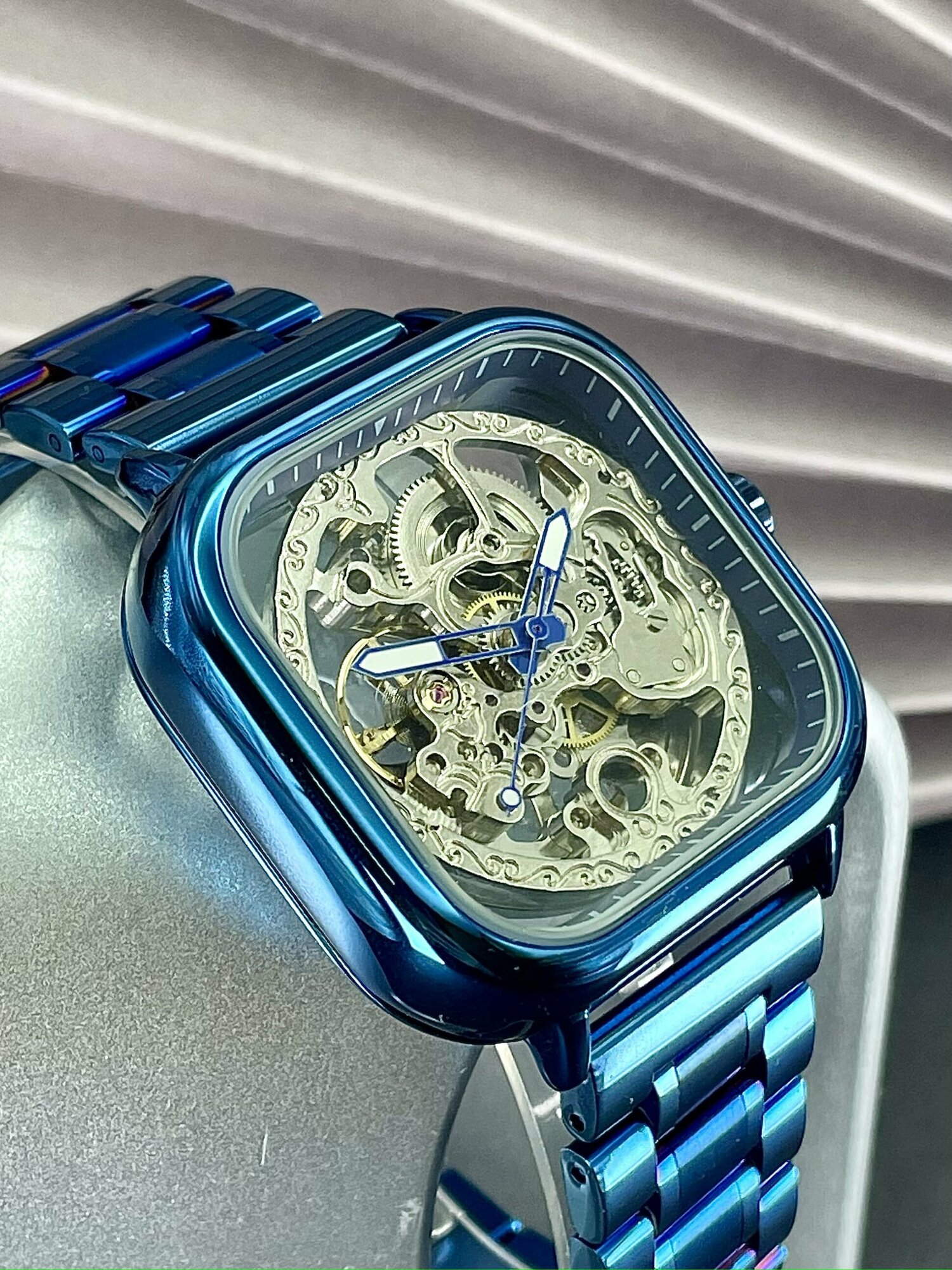 автоподзавод, антибликовое покрытие стекла, бесшумный механизм, подсветка стрелок, прозрачный корпус, скелетон
