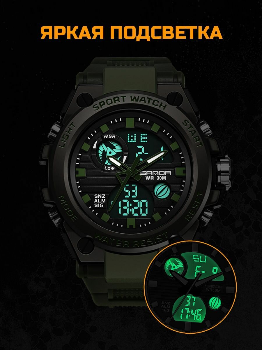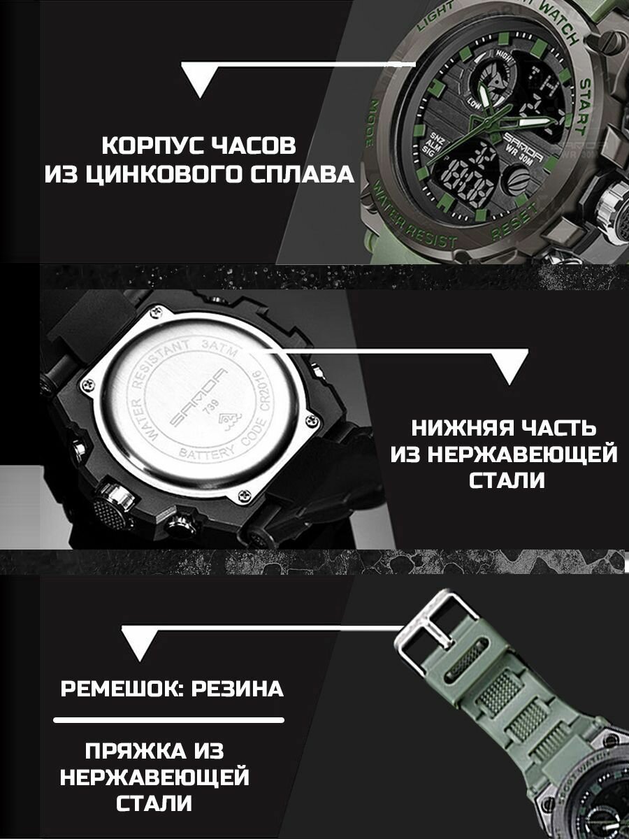 | Особенности | LED-дисплей, бесшумный механизм, водонепроницаемые, подсветка дисплея, подсветка стрелок, противоударные |