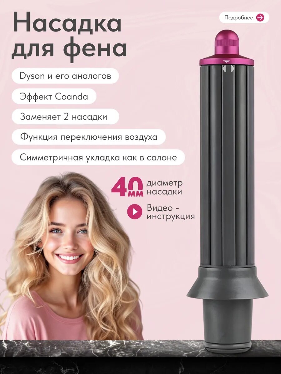 Насадка для фена Dyson Supersonic и Super hair dryer - прибор, который создаст идеальную укладку и шикарные локоны, а также превратит фен дайсон в стайлер. Цилиндрическая насадка это сочетание стильного дизайна и передовой технологии - диаметр 40 мм обеспечивает идеальную форму локонов. Благодаря переключению потока воздуха вы можете создавать волны по часовой и против часовой стрелки - вам больше не придется выбирать между самыми модными и желанными прическами, теперь они доступны прямо у вас дома. Улучшенная модель позволяет не менять несколько насадок, а использовать всего одну - достаточно изменить поток воздуха Coanda и наслаждаться процессом. Одним из основных преимуществ является их безопасность - работая без экстремальных температур, они сохранят здоровье и красоту ваших волос. Насадка для брашинга - это еще один способ добавить объем вашим волосам, а уникальная конструкция и профессиональное качество обеспечивают максимальную эффективность в создании объемной и пышной укладки. Магнитный переходник позволяет легко и быстро установить насадку на ваш фен. Она подходит для всех типов волос - непослушных, кудрявых, прямых, объемных и даже тонких. Для создания причёски поднесите стайлер к пряди волос и позвольте сделать ей всю работу за несколько секунд. И чтобы сделать наше предложение еще более привлекательным, мы положили в подарок крабик. Наслаждайтесь безупречной укладкой и получите приятный бонус вместе с нашей насадкой для фена Dyson Supersonic и Super hair dryer.