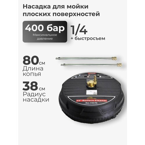 Профессиональная насадка для мойки плоских поверхностей. Подходит для мытья плитки, тротуаров, дорожек, кирпича и других плоских поверхностей. Позволяет эффективно и быстро очищать и мыть плоские и твердые поверхности. Состоит из насадки, составного копья (80 см), быстросъемного ниппеля, в том числе под определенные модели моек высокого давления. Совместима с любыми мойками и аппаратами высокого давления. Резьба на входе: 1/4 + быстросъем.