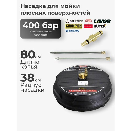 Профессиональная насадка для мойки плоских поверхностей. Подходит для мытья плитки, тротуаров, дорожек, кирпича и других плоских поверхностей. Позволяет эффективно и быстро очищать и мыть плоские и твердые поверхности. Состоит из насадки, составного копья (80 см), быстросъемного ниппеля, в том числе под определенные модели моек высокого давления. Совместима с любыми мойками и аппаратами высокого давления. Резьба на входе: 1/4 + быстросъем и ниппель для мойки Sterwins, Lavor, Elitech, Champion, Интерскол, HUTER, DAEWOO.