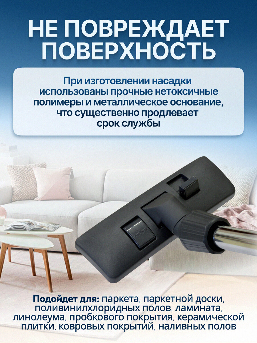 Комбинированная насадка Filtero FTN 02 "пол – ковер" с шириной рабочей зоны 26 см оснащена универсальным зажимом, который обеспечивает возможность использования насадки с большинством пылесосов известных марок, с диаметром удлинительной трубки 30 - 37 мм. Насадка Filtero FTN 02 с удобным в переключении 2-х позиционным переключателем "жесткий пол - ковер" позволяет производить уборку любых напольных покрытий.