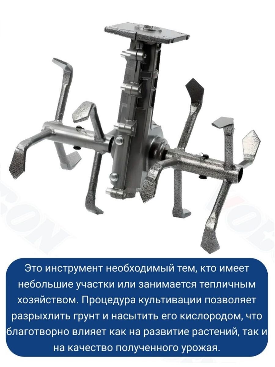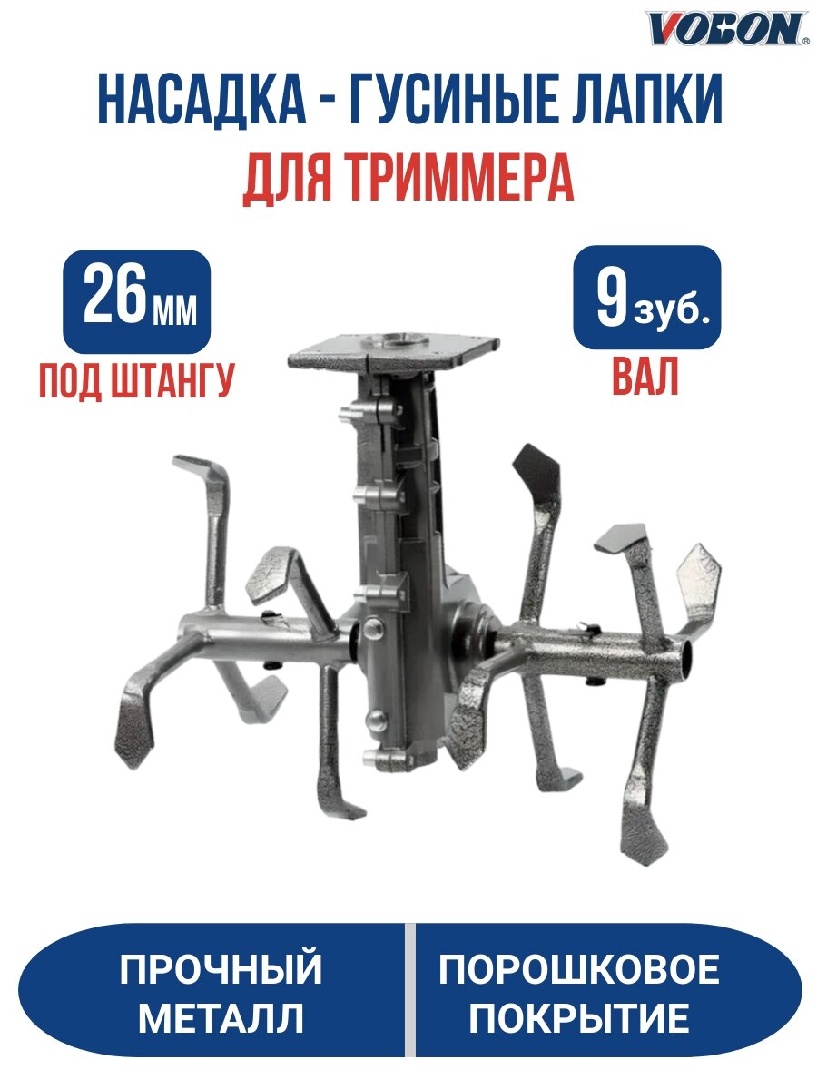 Насадка культиватор для триммера применяется для рыхления почв. Подходит для бензиновых триммеров 26 мм 9 шлицов. Насадка на бензокосу может использоваться как окучник, который поможет быстро обработать картофельное поле, а также как техника для прополки не занятых посевами территорий. Подходит для штанги диаметром 26 мм, вал имеет 9 зубьев. Ширина захвата обрабатываемой площади составляет 30 см. Насадка не просто культивирует почву, а насыщает ее кислородом.