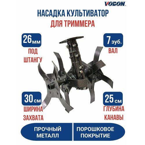 Насадка-культиватор для мотокосы VOBON 26мм (7 шлиц)-высокоэффективное и надежное сельскохозяйственное оборудование, предназначенное для обработки различных типов почв. Насадка культиваторная обеспечивает равномерное перемешивание грунта и распределение удобрений, что способствует повышению урожайности и улучшению качества почвы. Установка насадки на бензотриммер проста и не требует особых навыков. Фреза для почвы универсальна и подходит для работы с различными типами почв, включая глинистые, песчаные и суглинистые, кроме того, насадка культиватор для триммеров может использоваться для ухода за посадками, такими как прополка, рыхление и удаление сорняков. Прочный и долговечный материал, из которого изготовлена насадка культиватор для триммеров, обеспечивает надежность и долгий срок службы садового инструмента. Рекомендуется изпользовать бензотриммера мошность 2.5 л. с и больше.