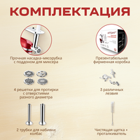 Содержимое коробки: 4 х решетки для протирки с отверстиями разного диаметра. 2 х трубки для набивки колбас 3 х различных лезвия 1 х прочная насадка-мясорубка с поддоном для миксера 1 х чистящая щетка 1 х проталкиватель