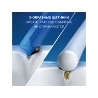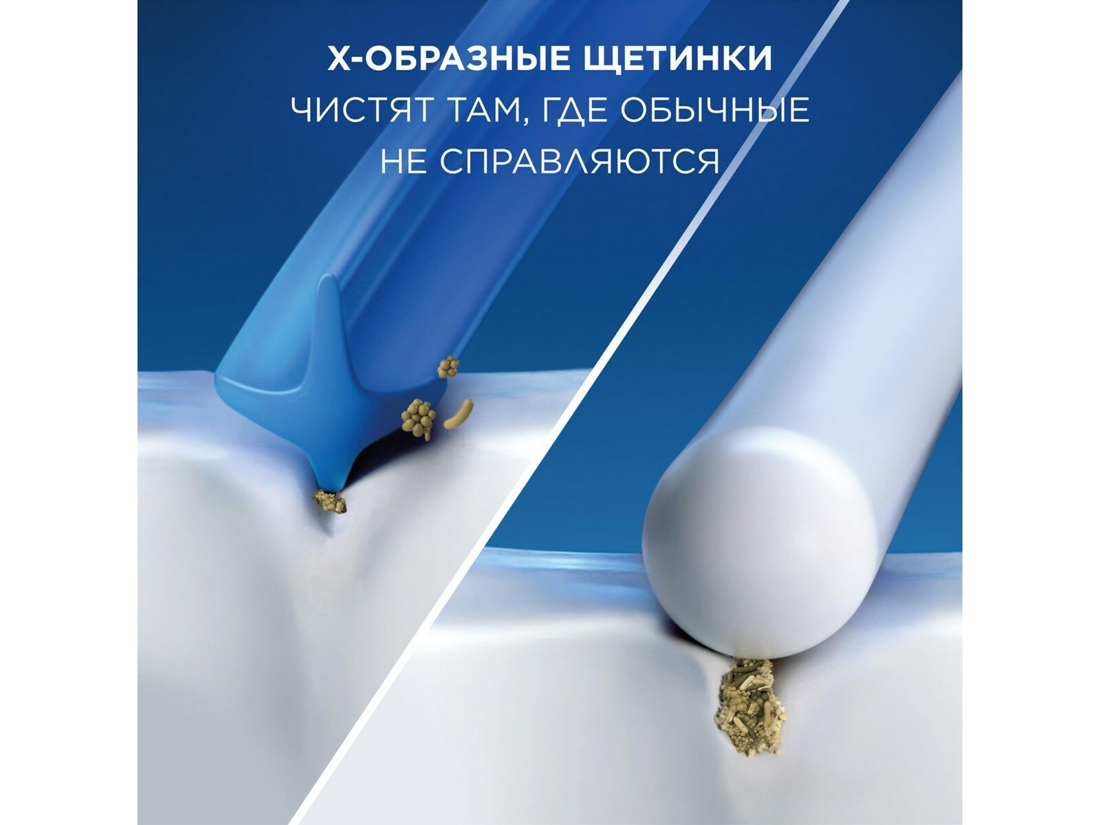 • Адаптивные X-образные щетинки достигают труднодоступные участки полости рта и удаляют до 100% больше бактериального налёта там, куда не дотягиваются круглые щетинки совместимых насадок от других производителей и обычные зубные щётки;