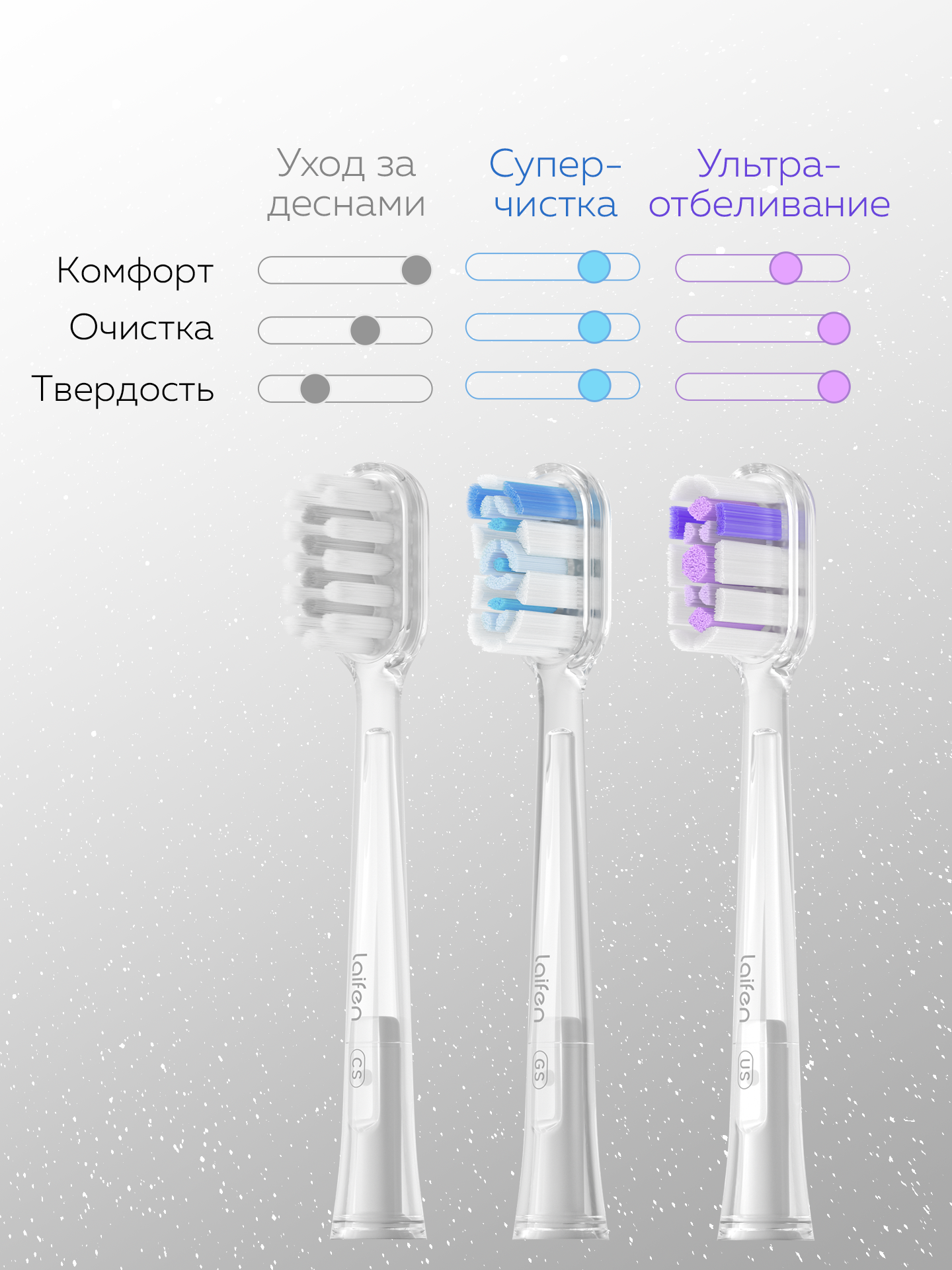 Бесцветные насадки Laifen Wave не только функциональны, но и эстетичны, гармонично сочетаясь с любым дизайном зубной щетки.