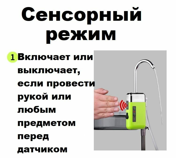 - Сенсорный. Включается и выключается нажатием и удерживанием соответствующей кнопки в течении 3 секунд. В данном режиме загорится индикатор над кнопкой включения и махнув рукой у датчика сенсора включится или выключится подача воды (или аэрация).