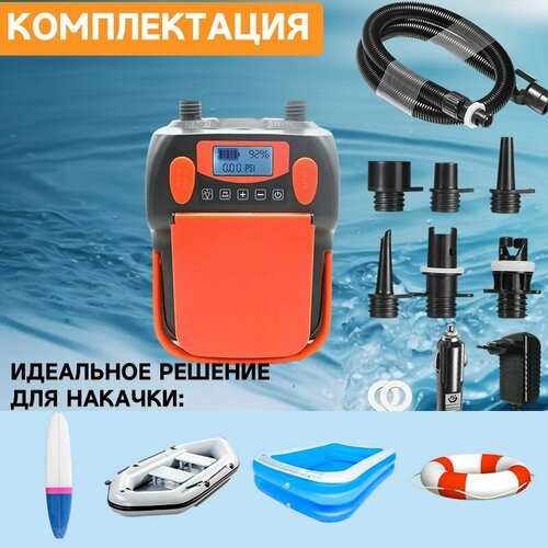 Купить Насос аккумуляторный двухступенчатый для лодок, sup HT-790 для лодки ПВХ, SUP досок, матрасов, батутов бассейнов, встроенным аккумулятором 6000 мАчШесть насадок в комплекте и ЖК-дисплей, с доставкой по всей России.